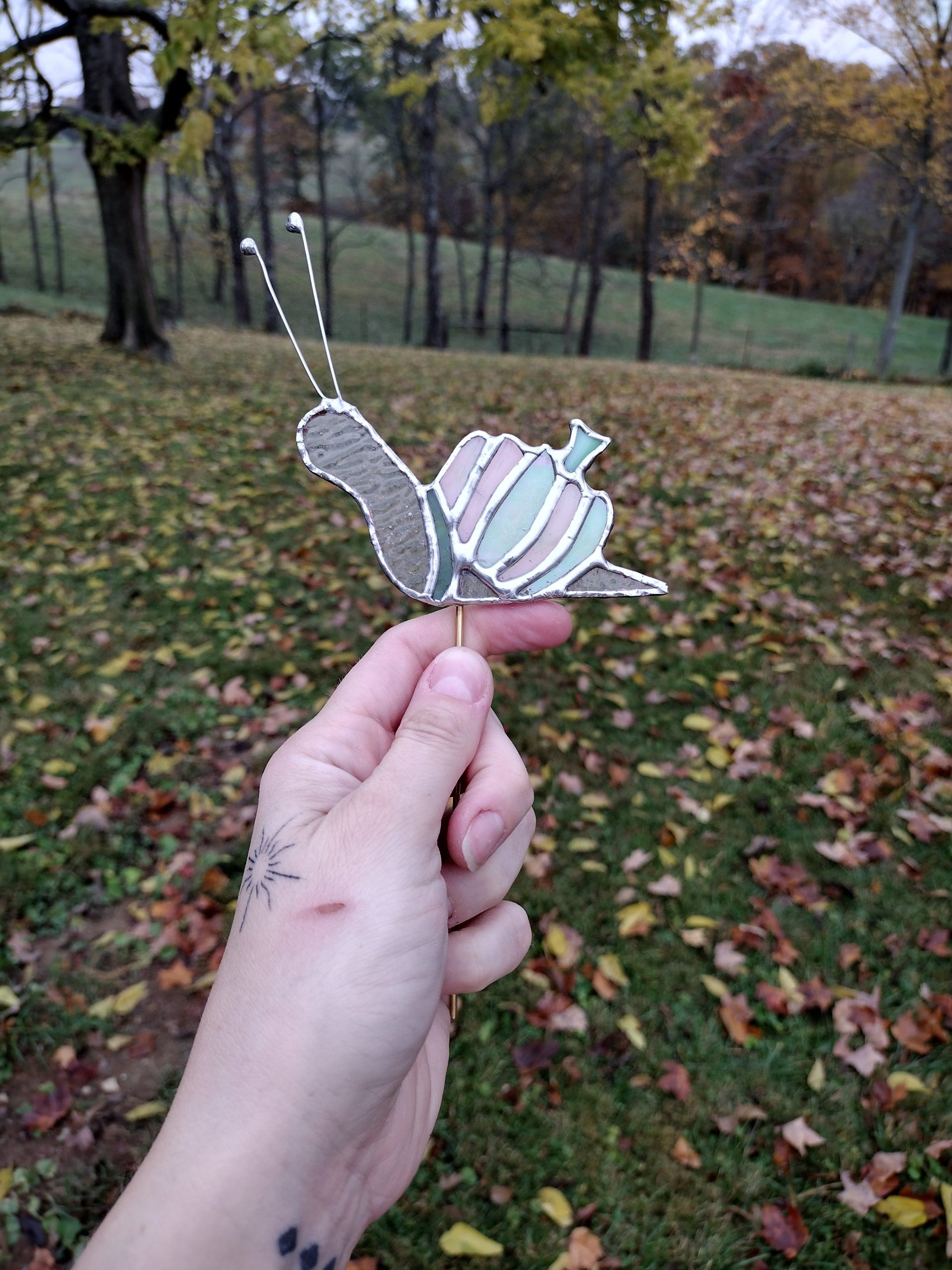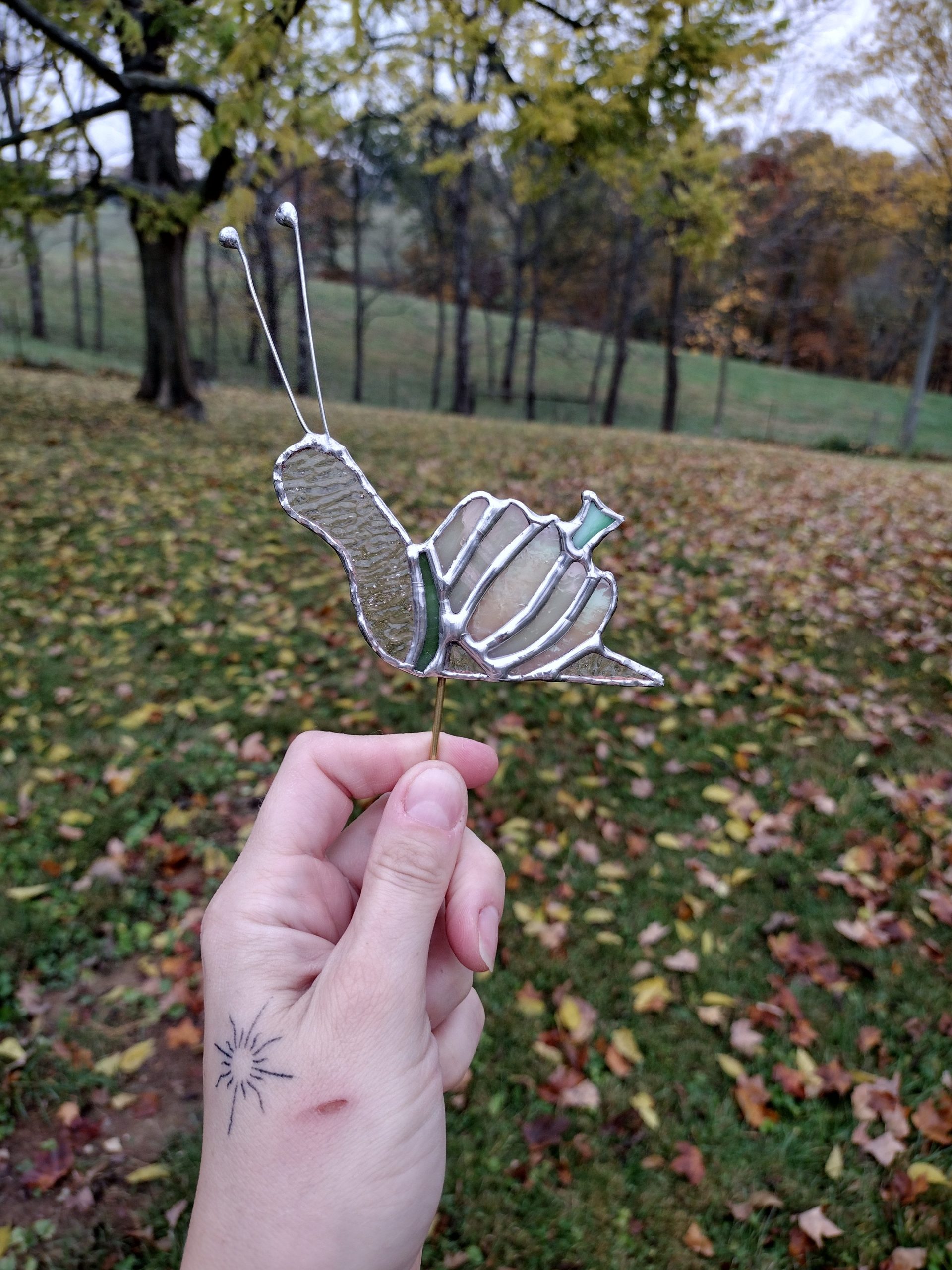 Made with Iridescent yellow, green opaque and clear textured glass. This ghosty snail is perfect for your favorite plant!