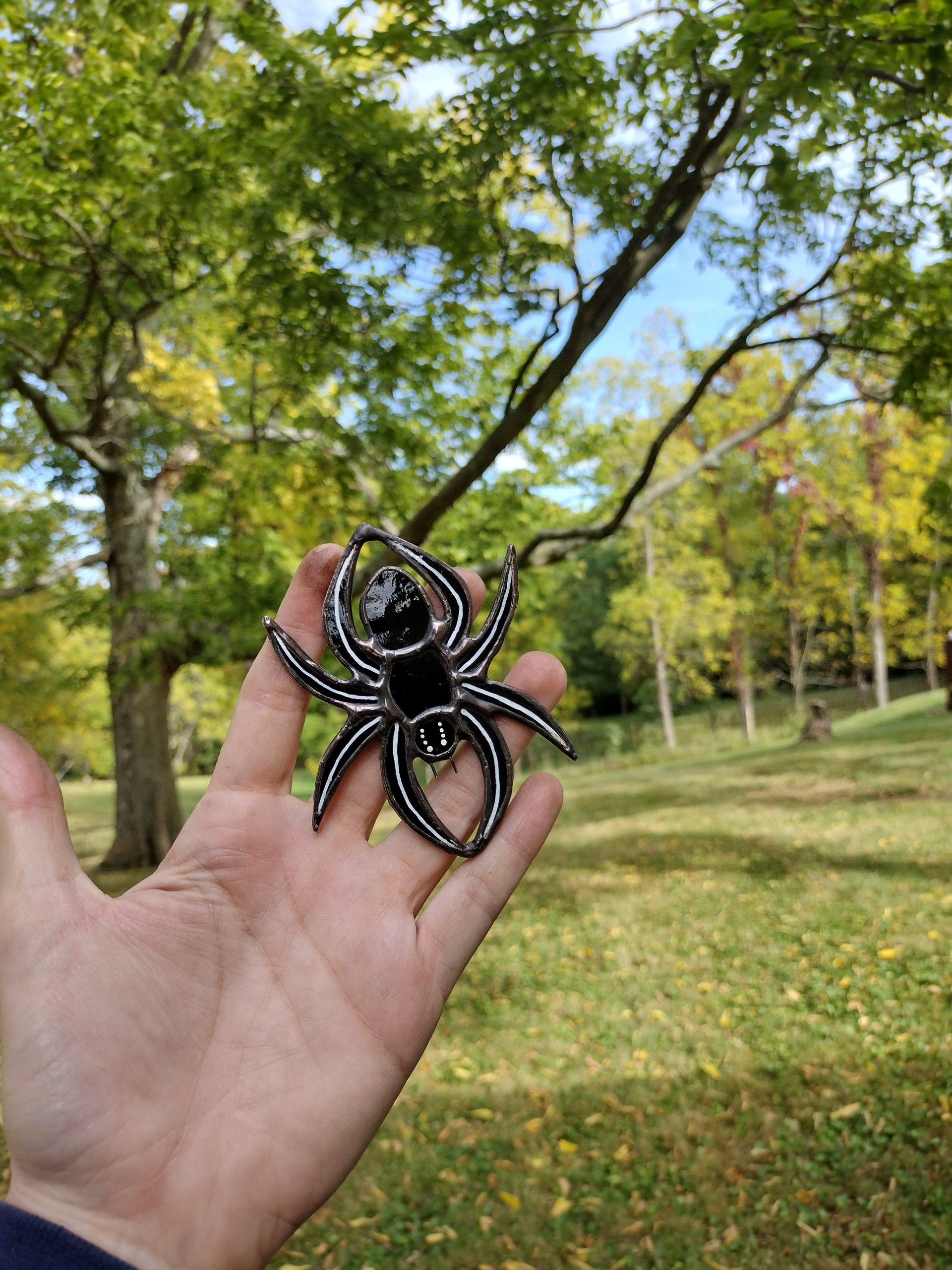 Made with black opaque glass, hand painted details fused on by baking. Has a clip to hang off your favorite plants! *Contains Lead*