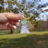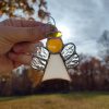 Made with opaque white glass, orange iridescent, clear textured and transparent yellow. Classic angel with a spin.