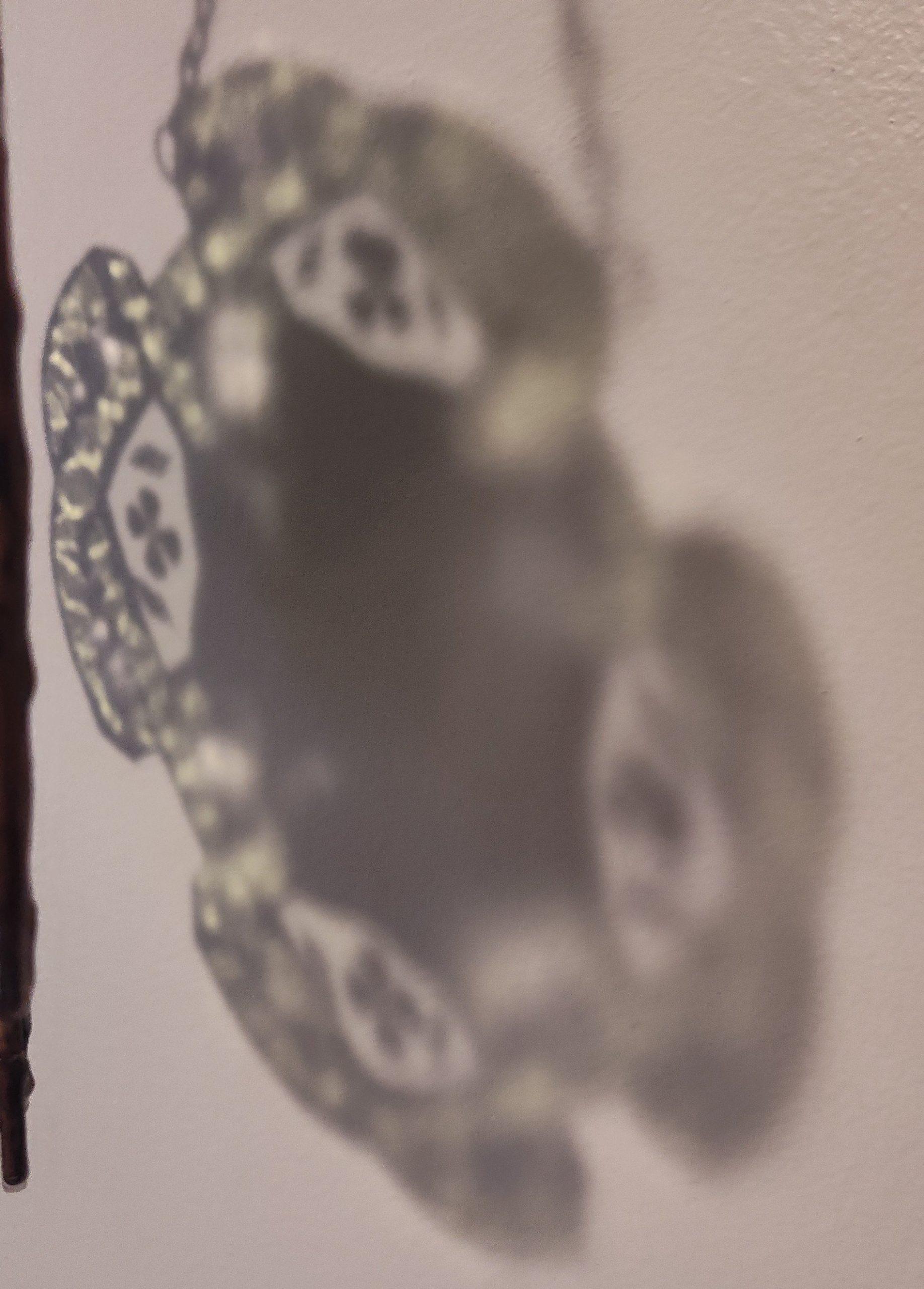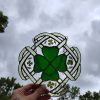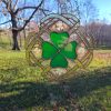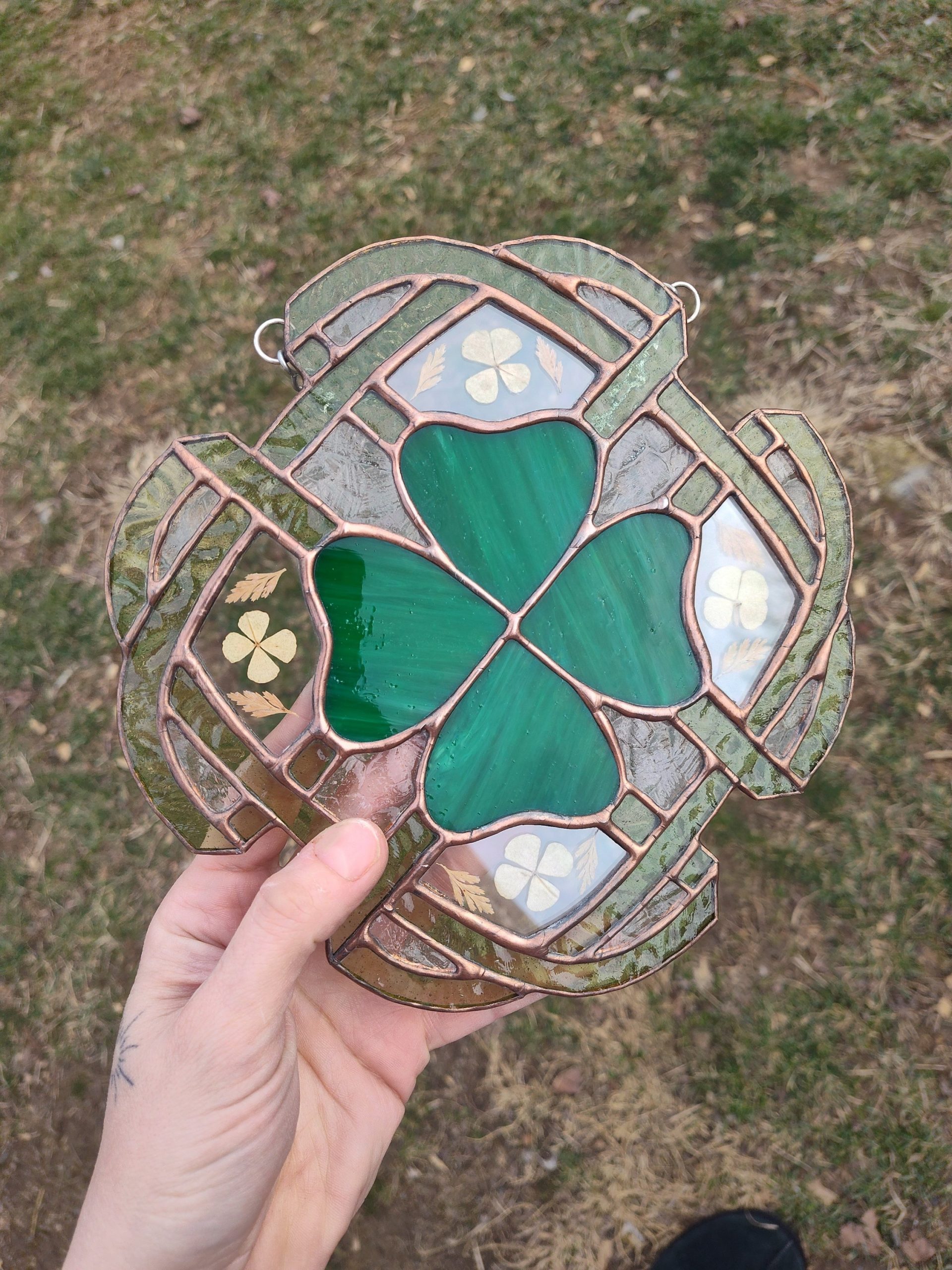 Made with green opaque glass for the clover. Translucent green textured for the knot and pressed four leaf clovers. Finished with copper patina. *Contains lead*