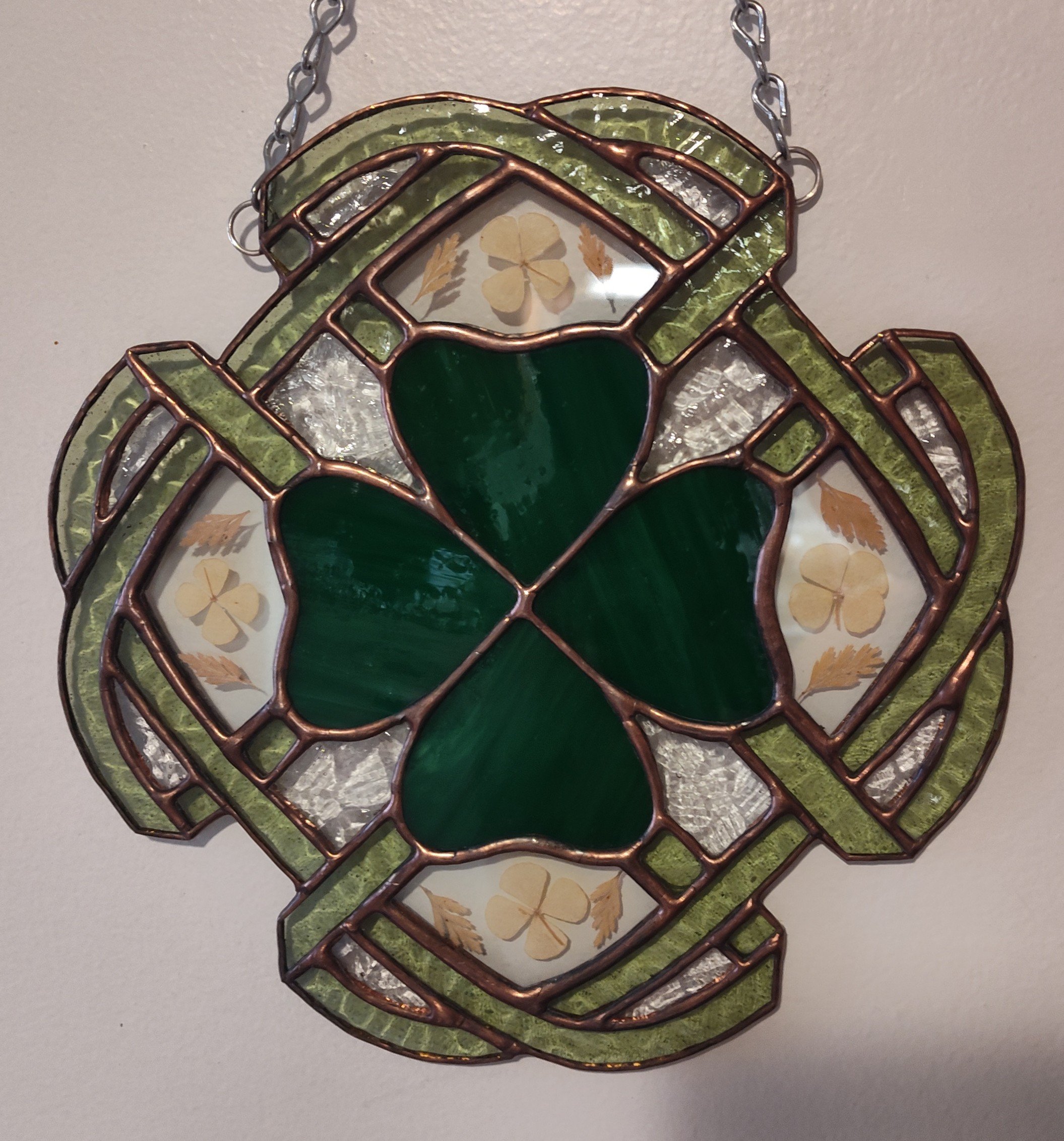 Made with green opaque glass for the clover. Translucent green textured for the knot and pressed four leaf clovers. Finished with copper patina.