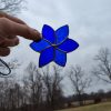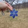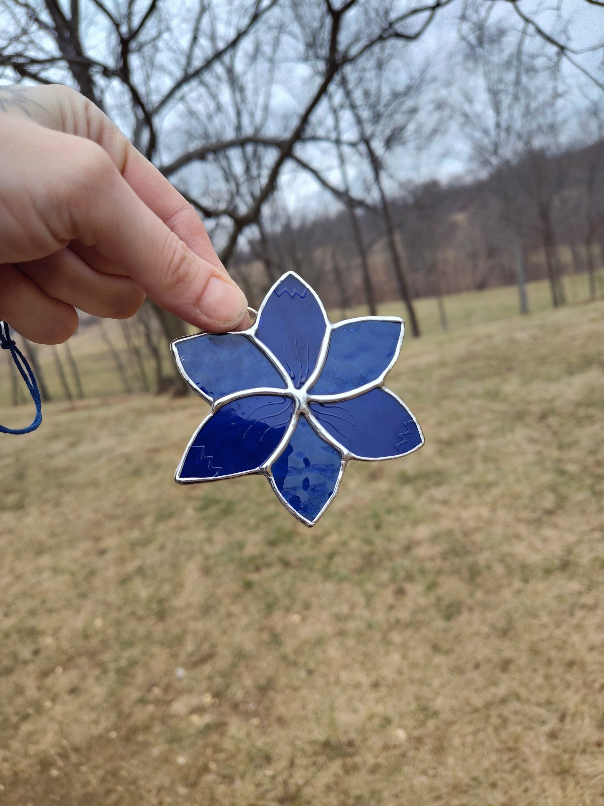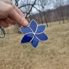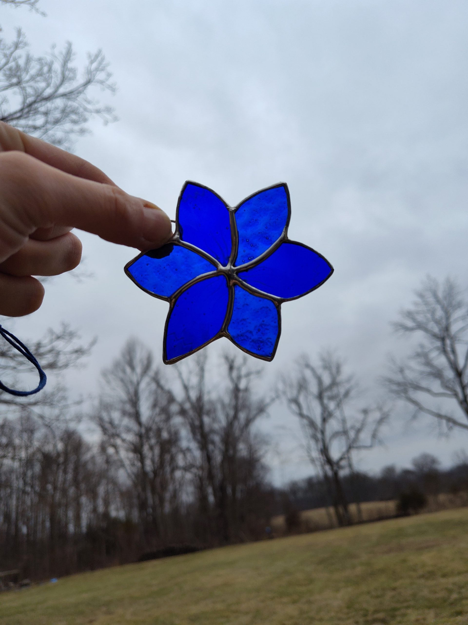 made with transparent dark blue and textured dark blue. with painted details fused on by baking. *contains Lead*
