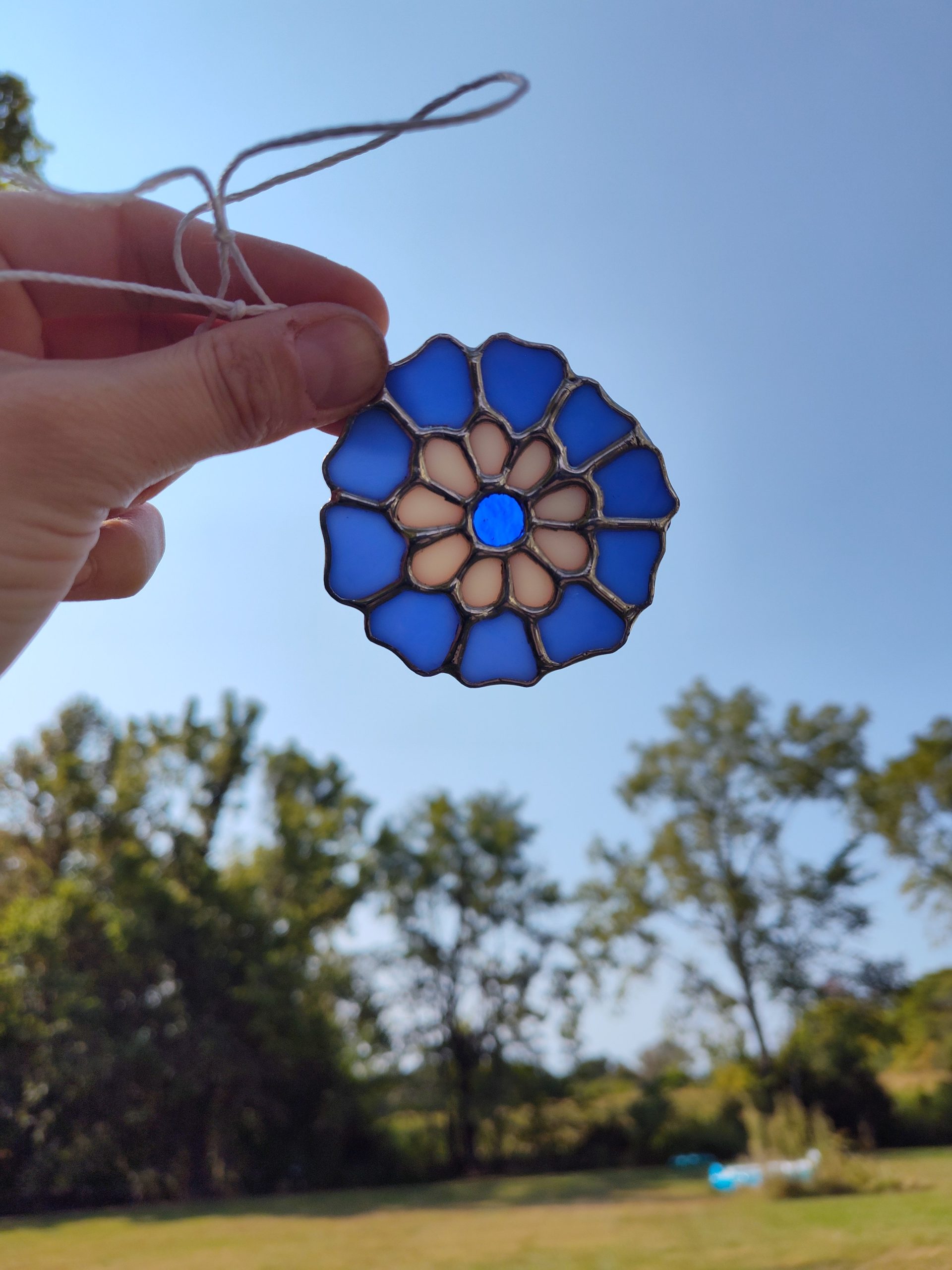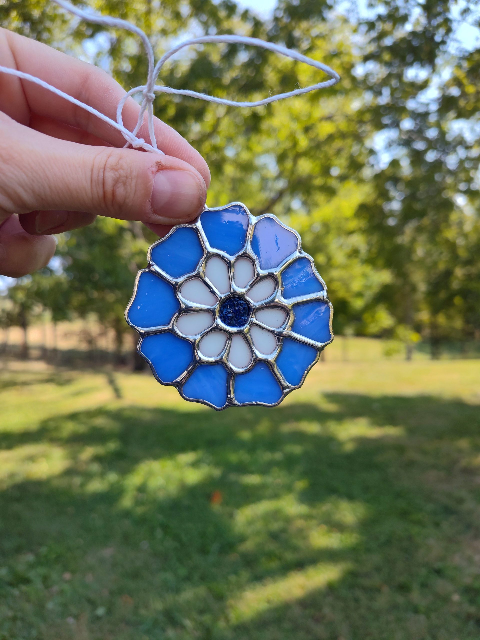 This flower is made up of blue and white opaque petals and a textured transparent blue center. *Contains Lead*