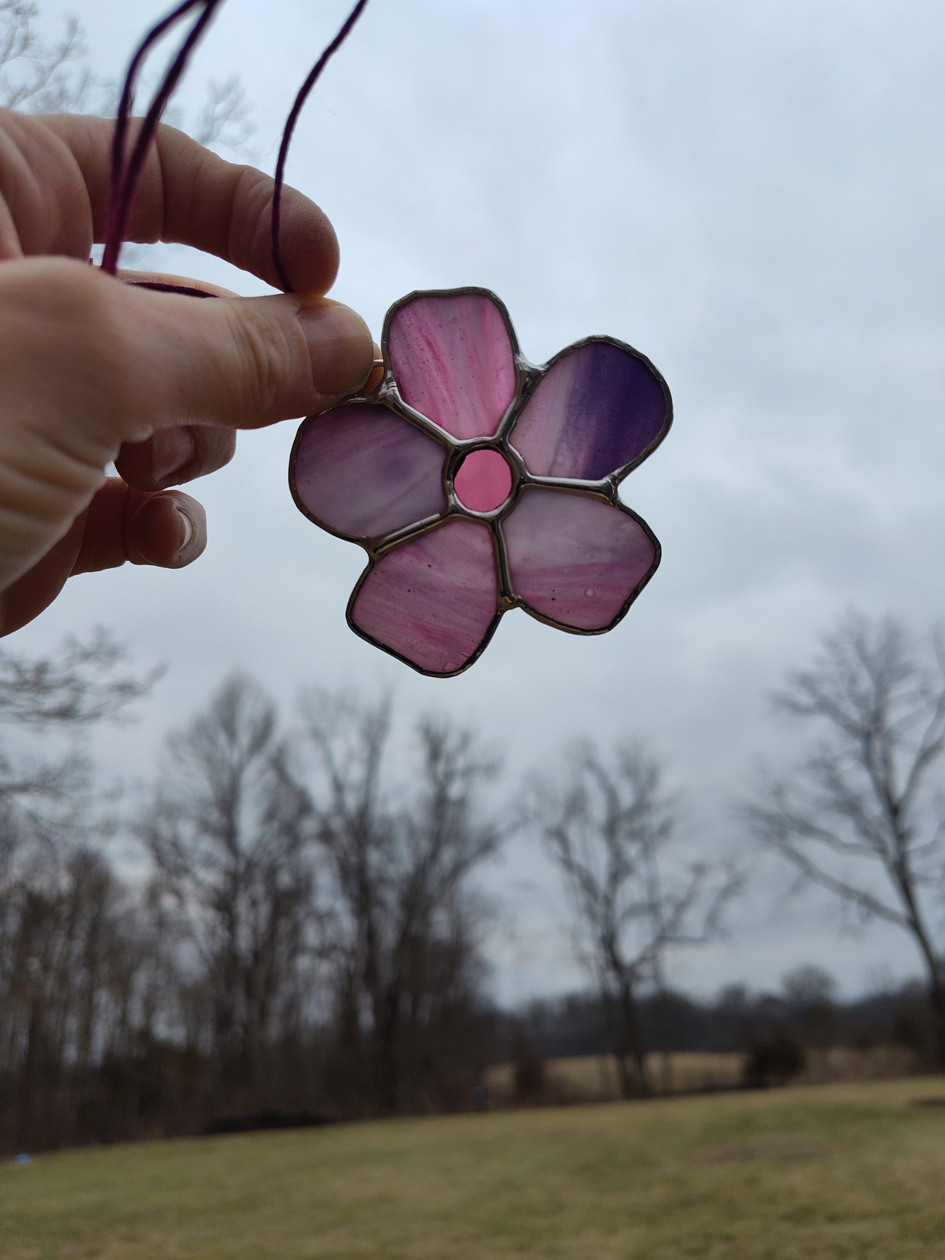 This flower is made with purple and pink wispy opaque glass. With a cranberry transparent center. *Contains Lead*