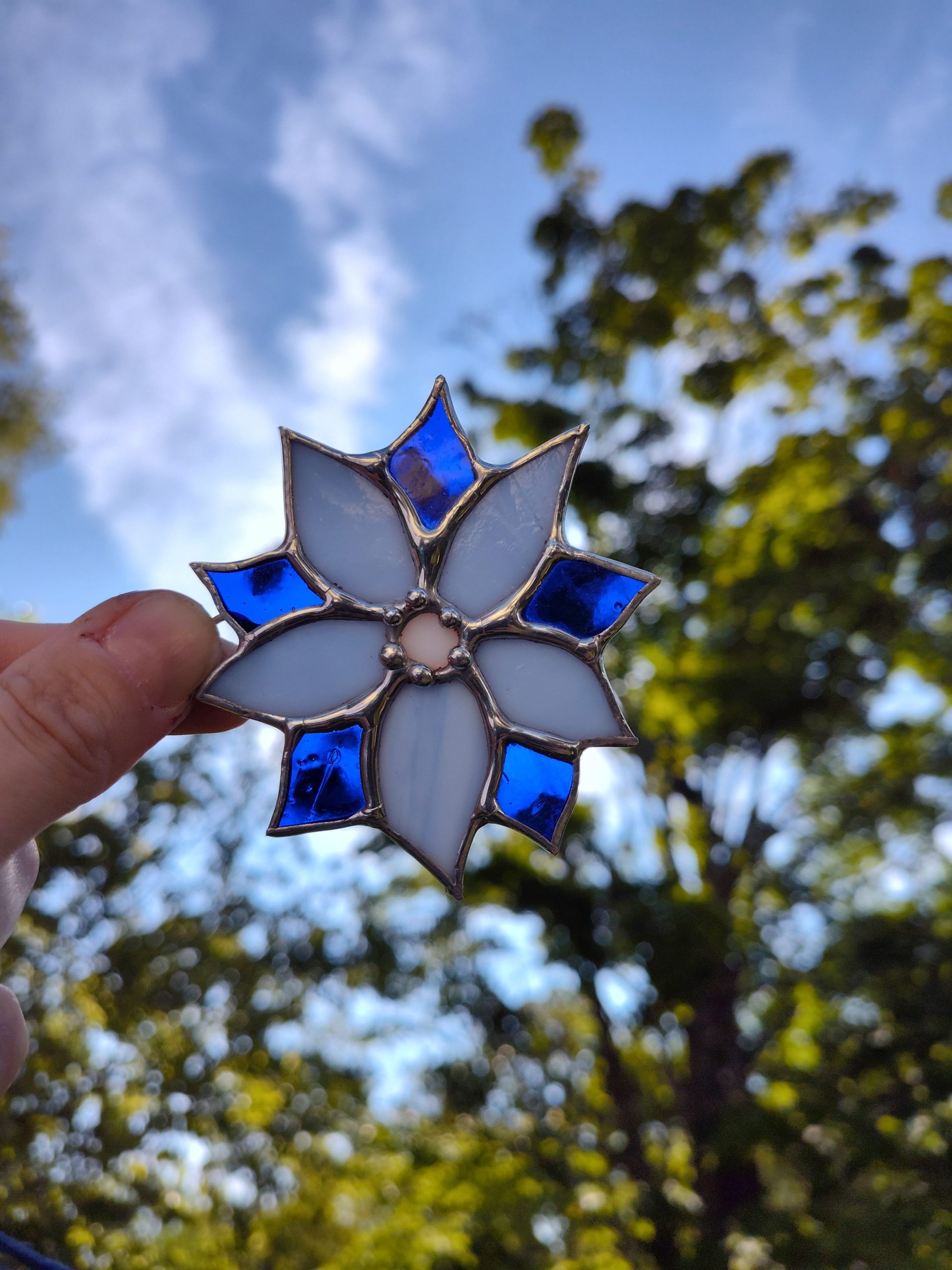 This car flower is made with different types of blue glass. transparent for the outer leaves and opaque for the main petals. With a white opaque glass center.