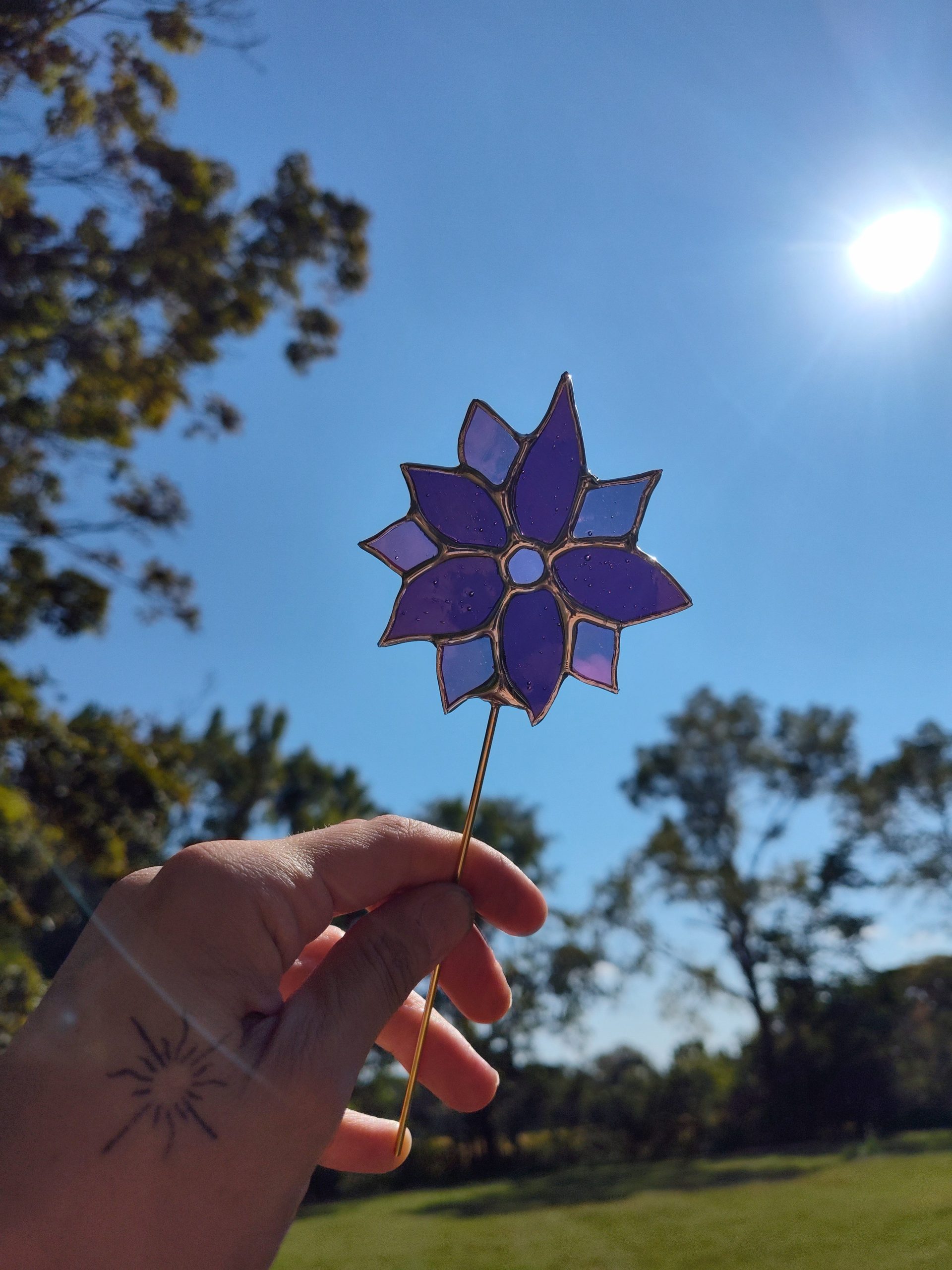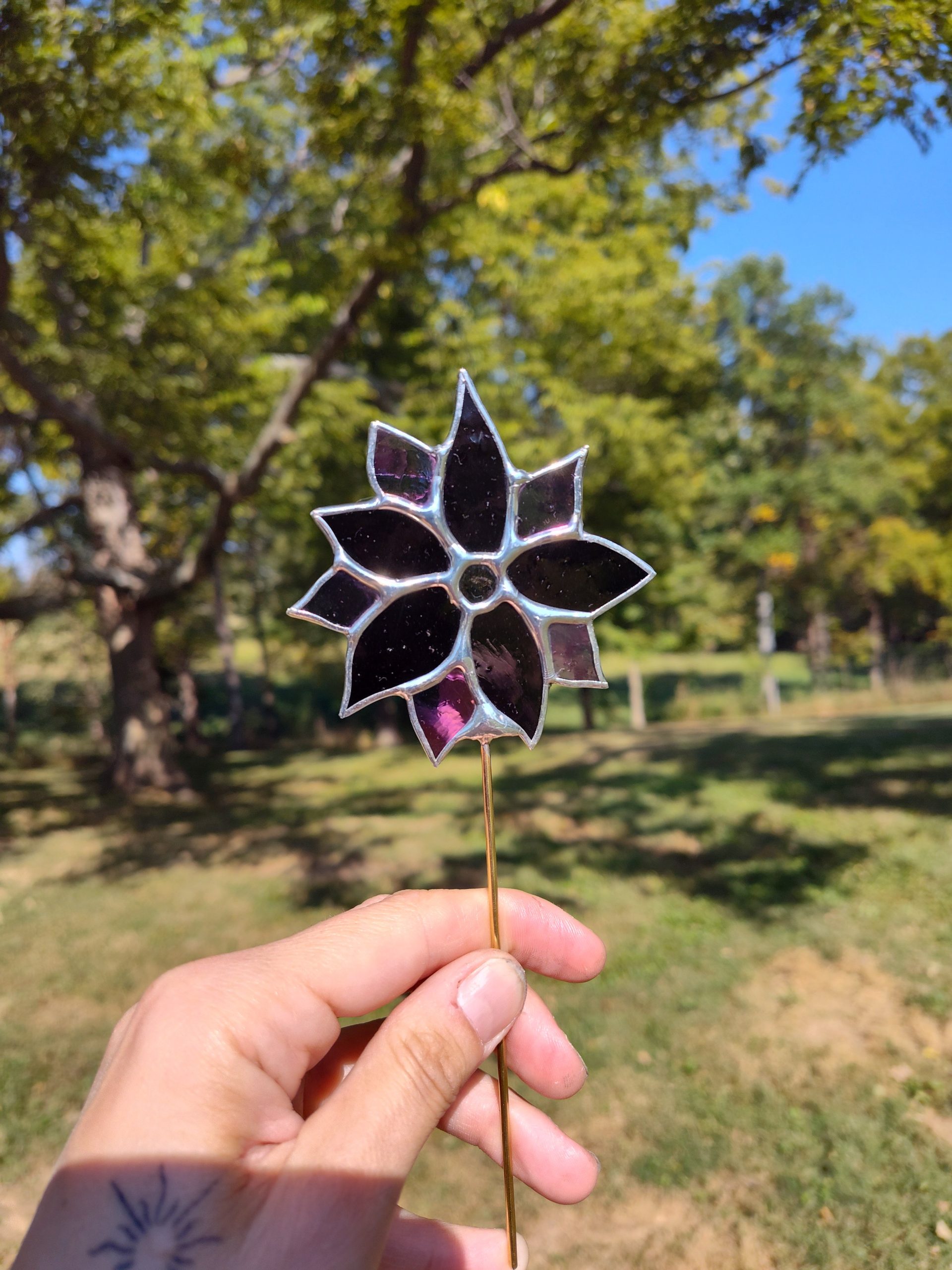 This flower is made of all different purple glass. A deep transparent glass for the main petals. Purple transparent iridescent for the outer petals and a light purple center. *Contains Lead*