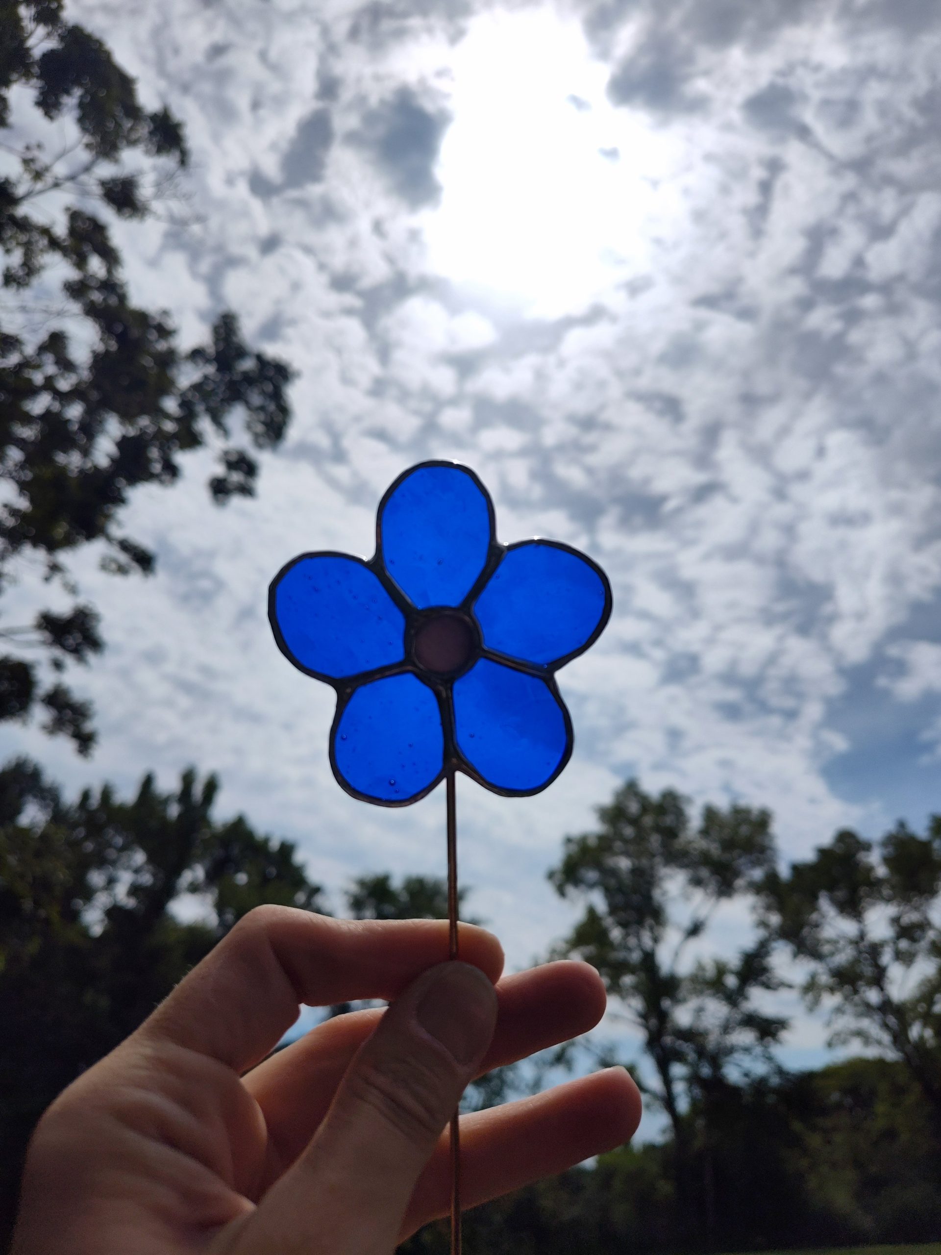 This flower is made with blue transparent glass and a light blue opaque glass center. *Contains Lead*