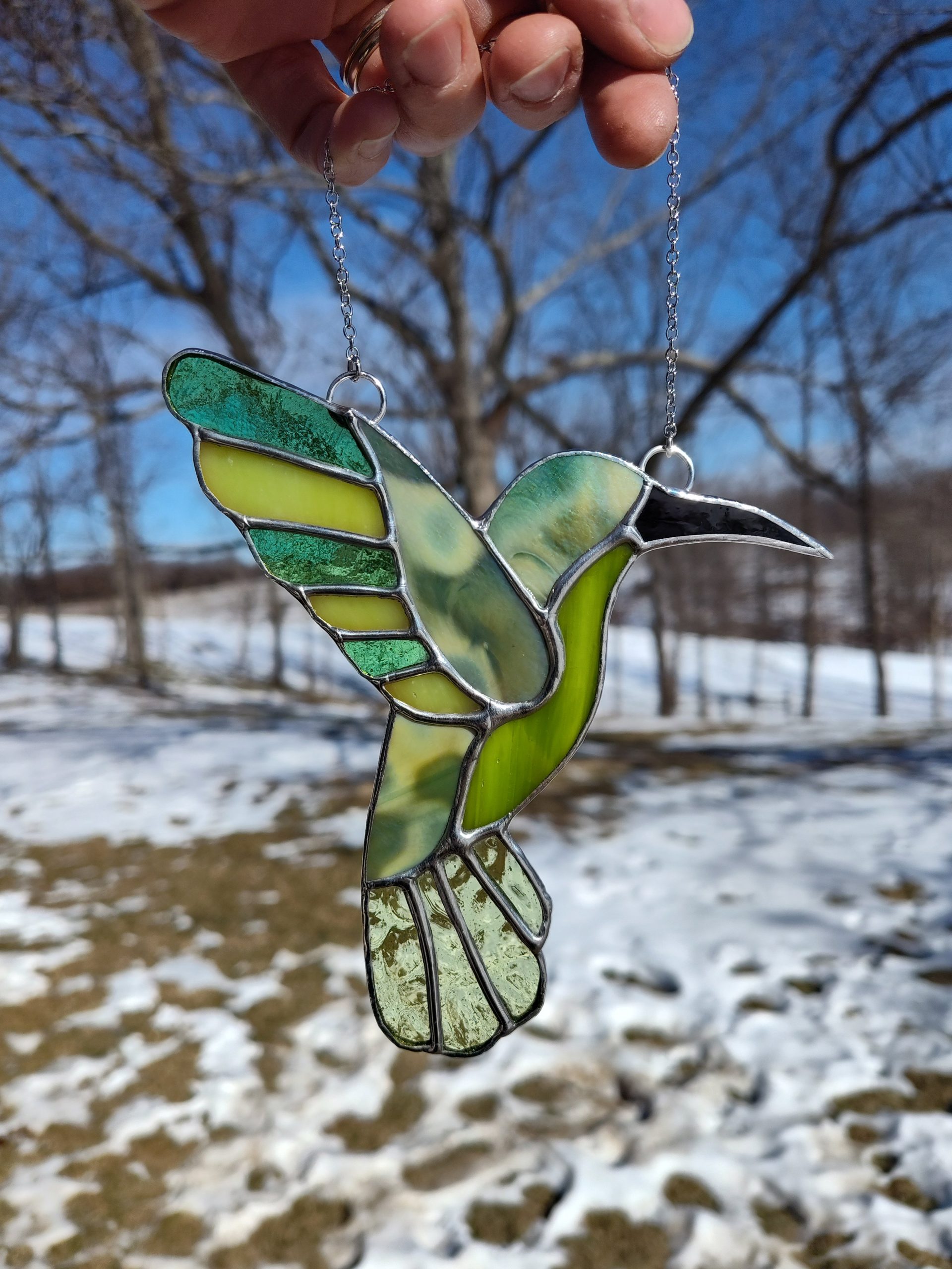 This hummingbird is made with opaque, transparent, textured, and Iridescent green glass.