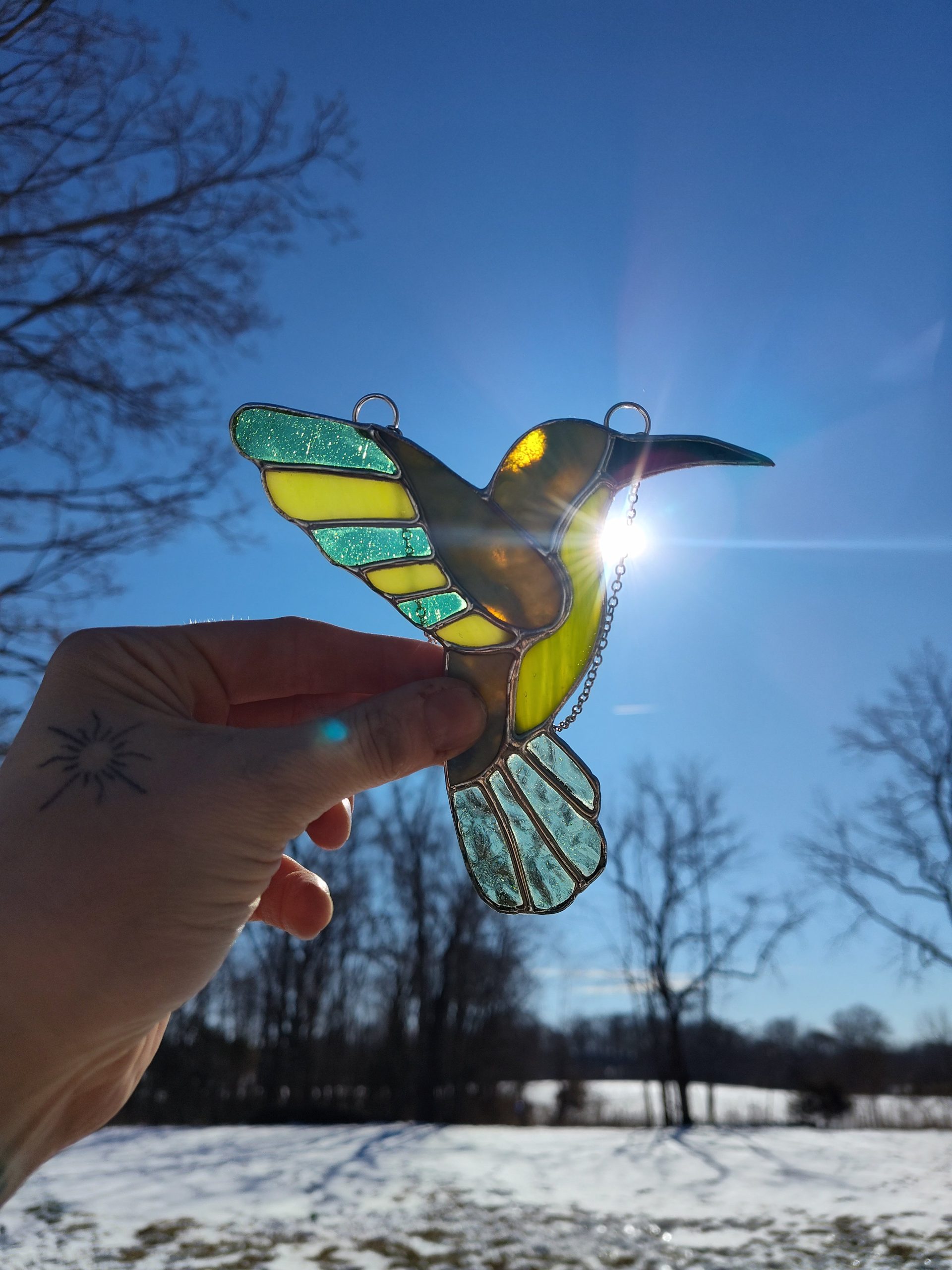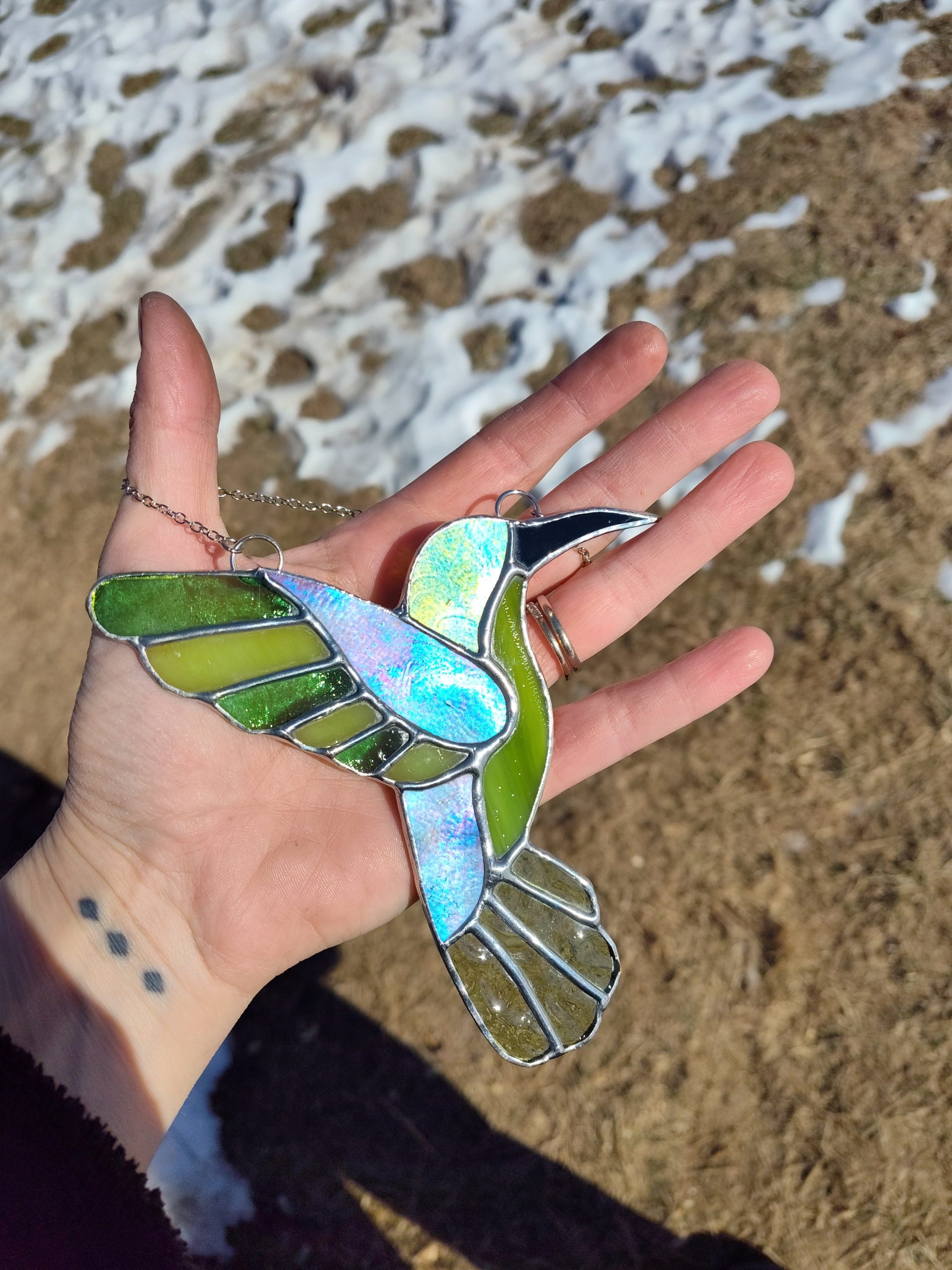 This hummingbird is made with opaque, transparent, textured, and Iridescent green glass. *Contains Lead*