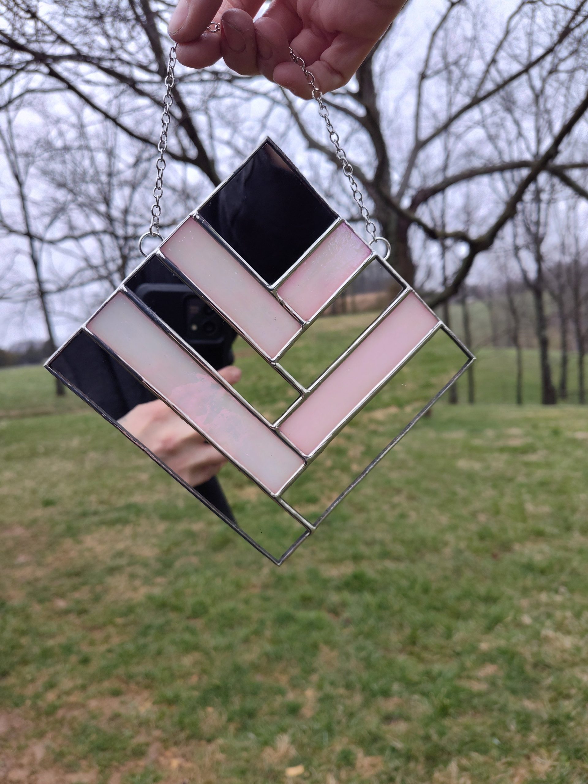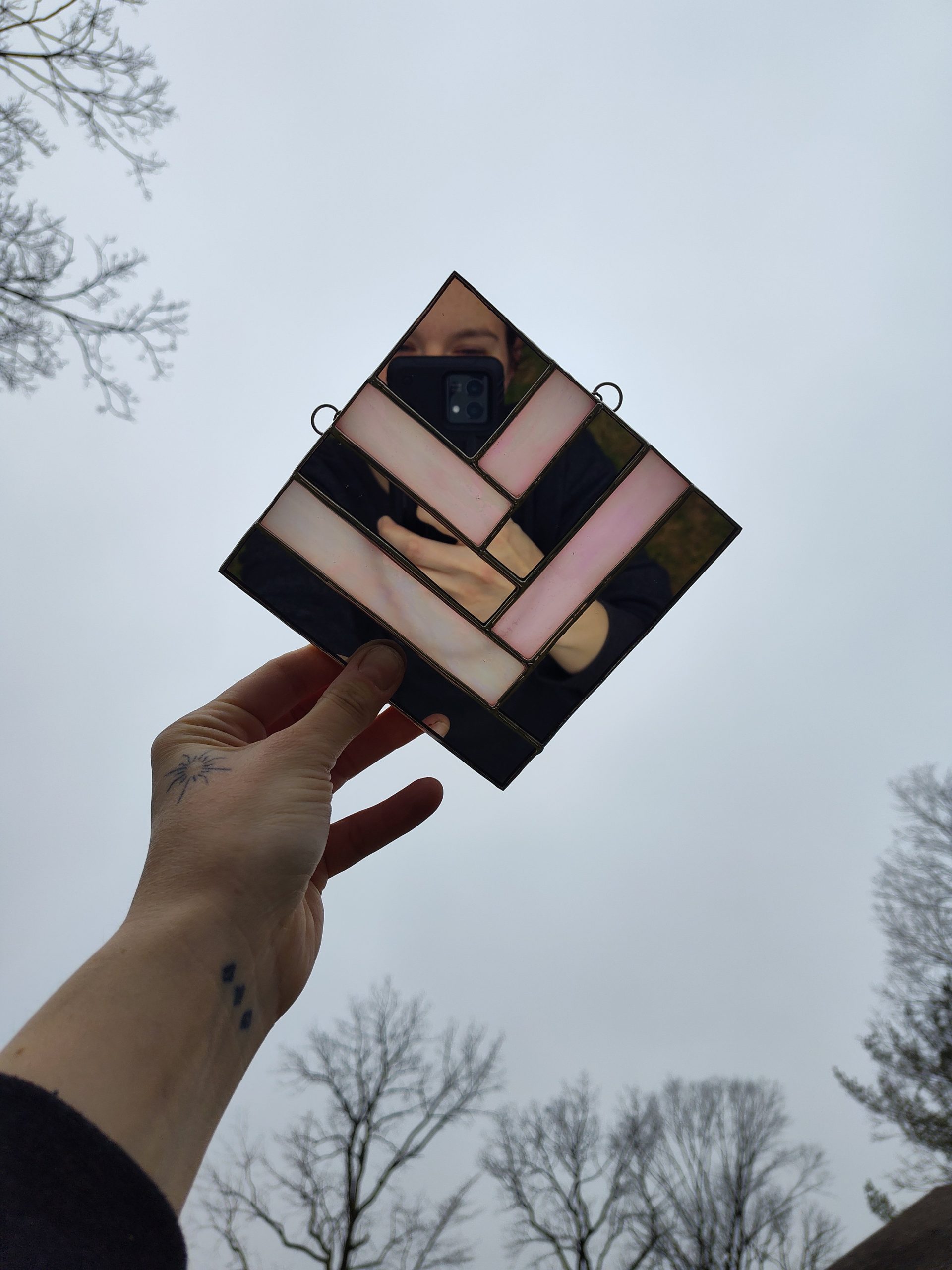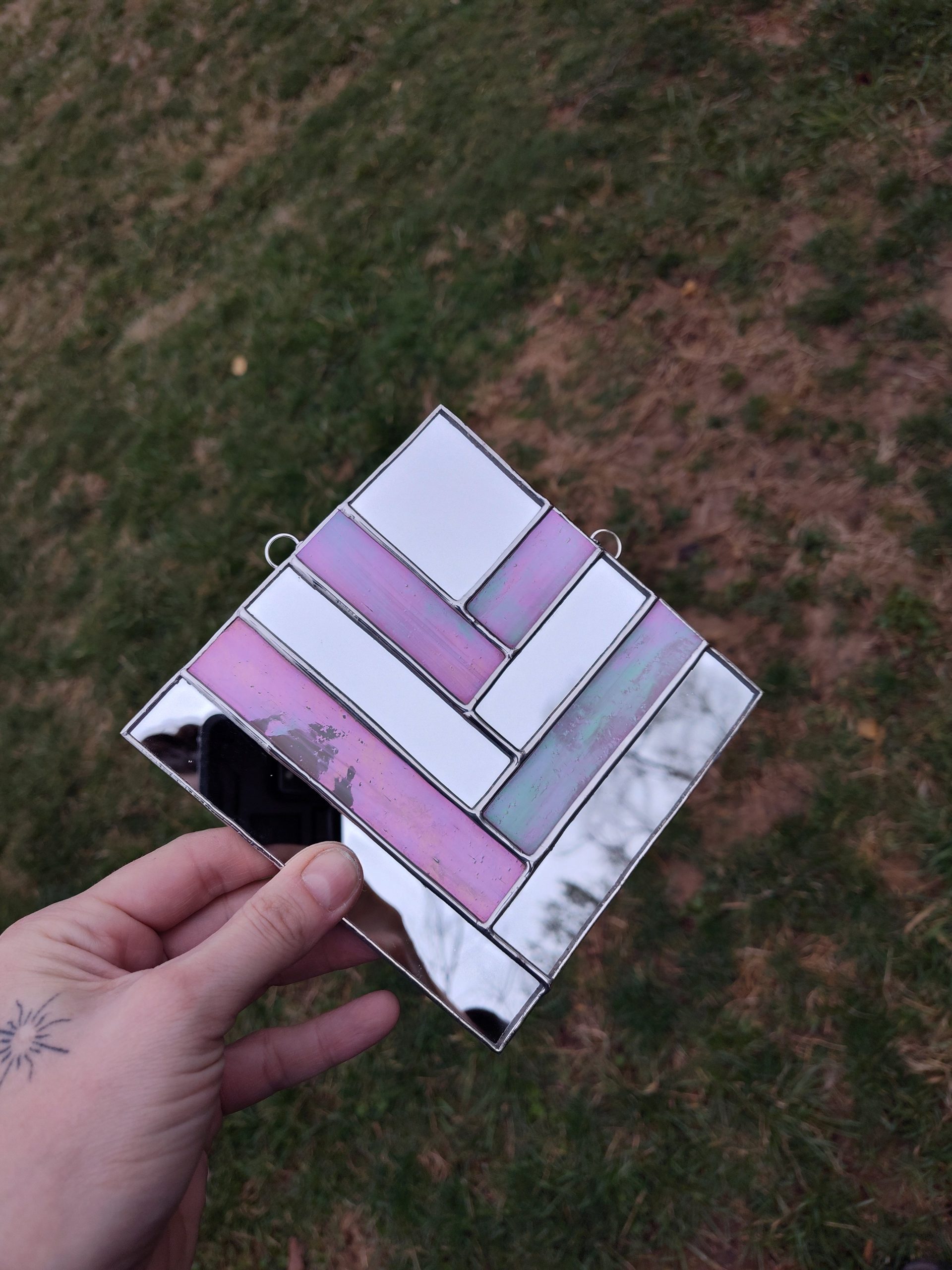 This mirror is made with pink iridescent translucent glass. *Contains Lead*