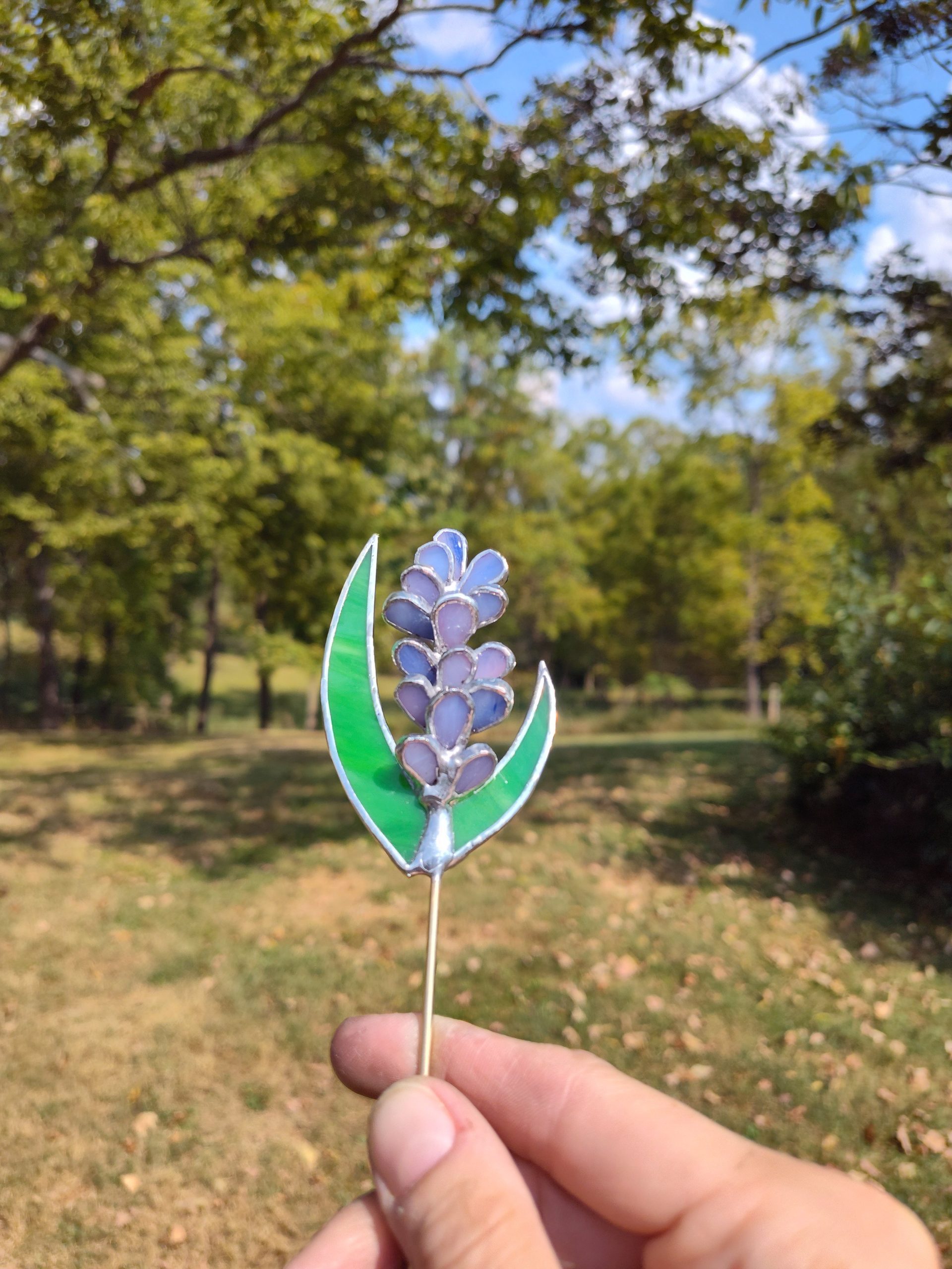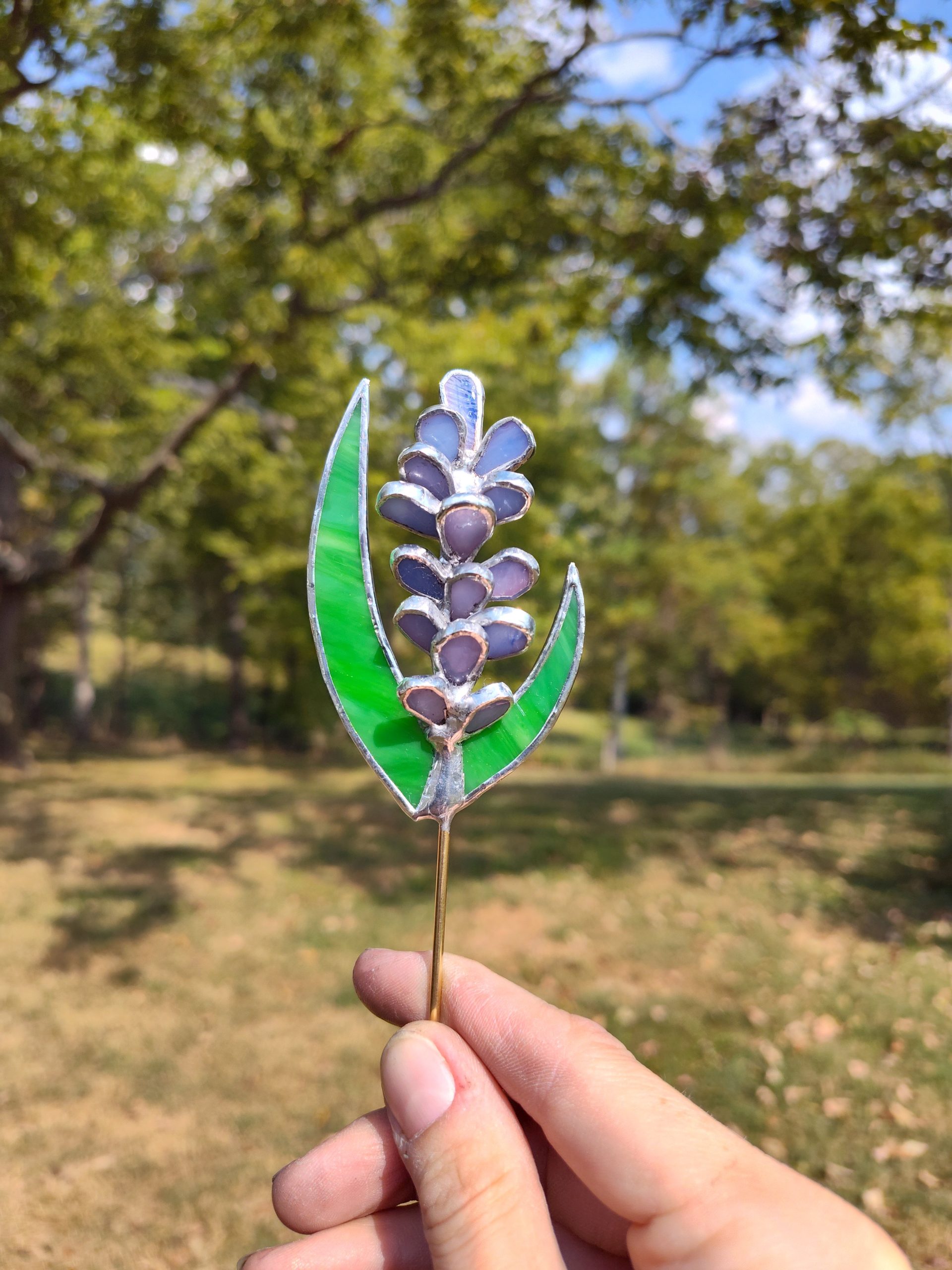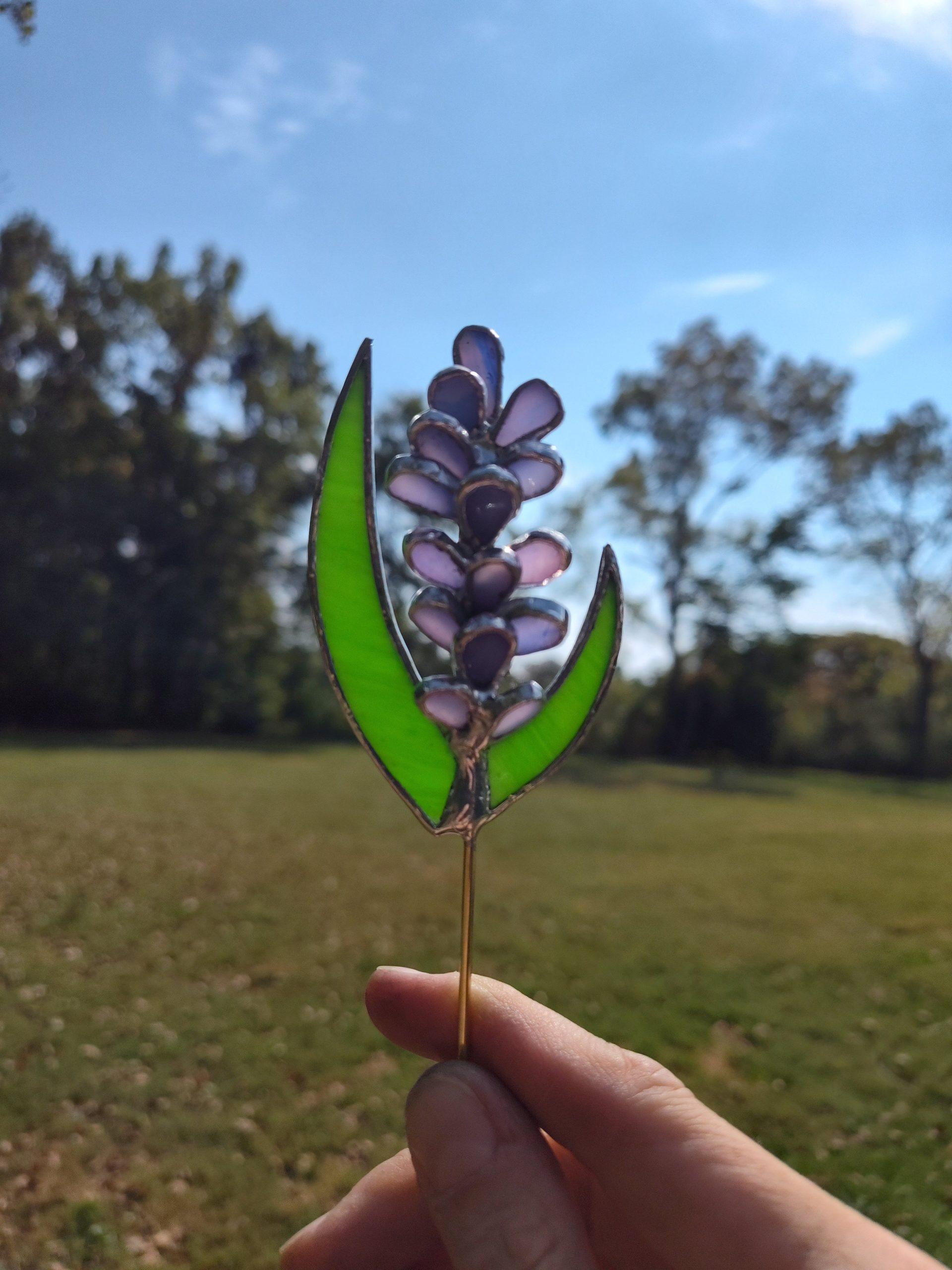 This lavender plant stake is made of opaque green and a wispy pink and purple opaque glass. This makes the perfect addition to any favorite house plant.