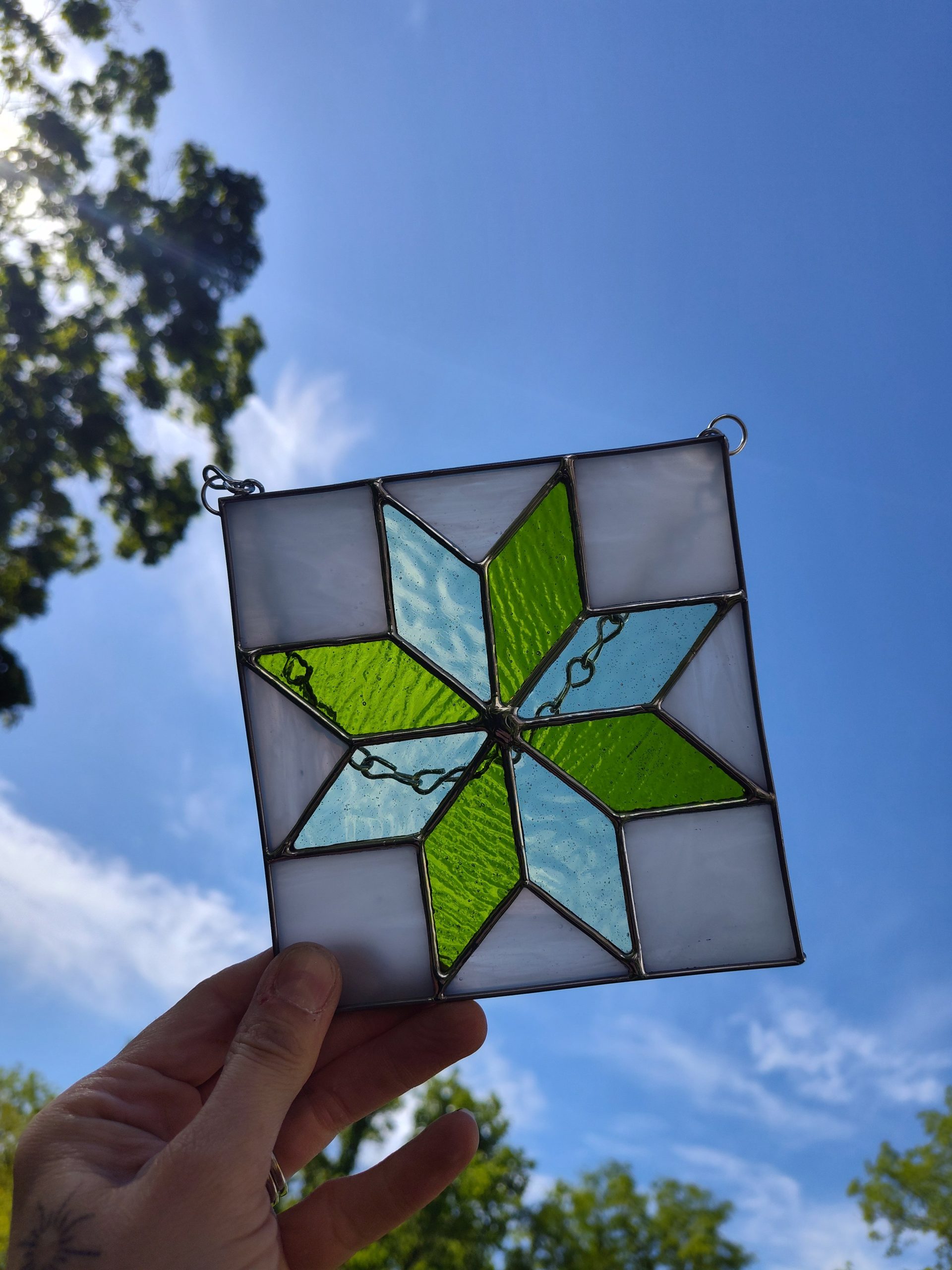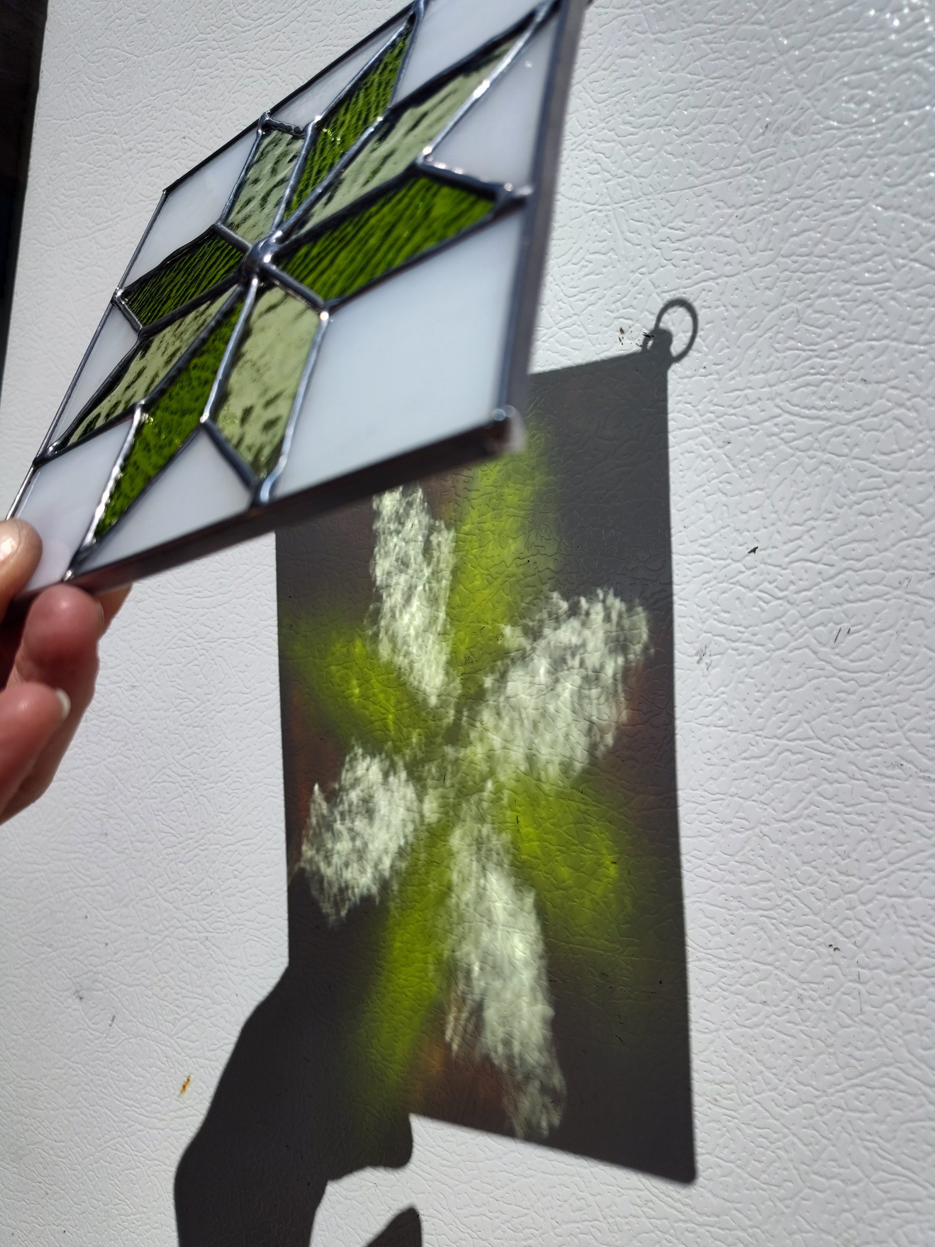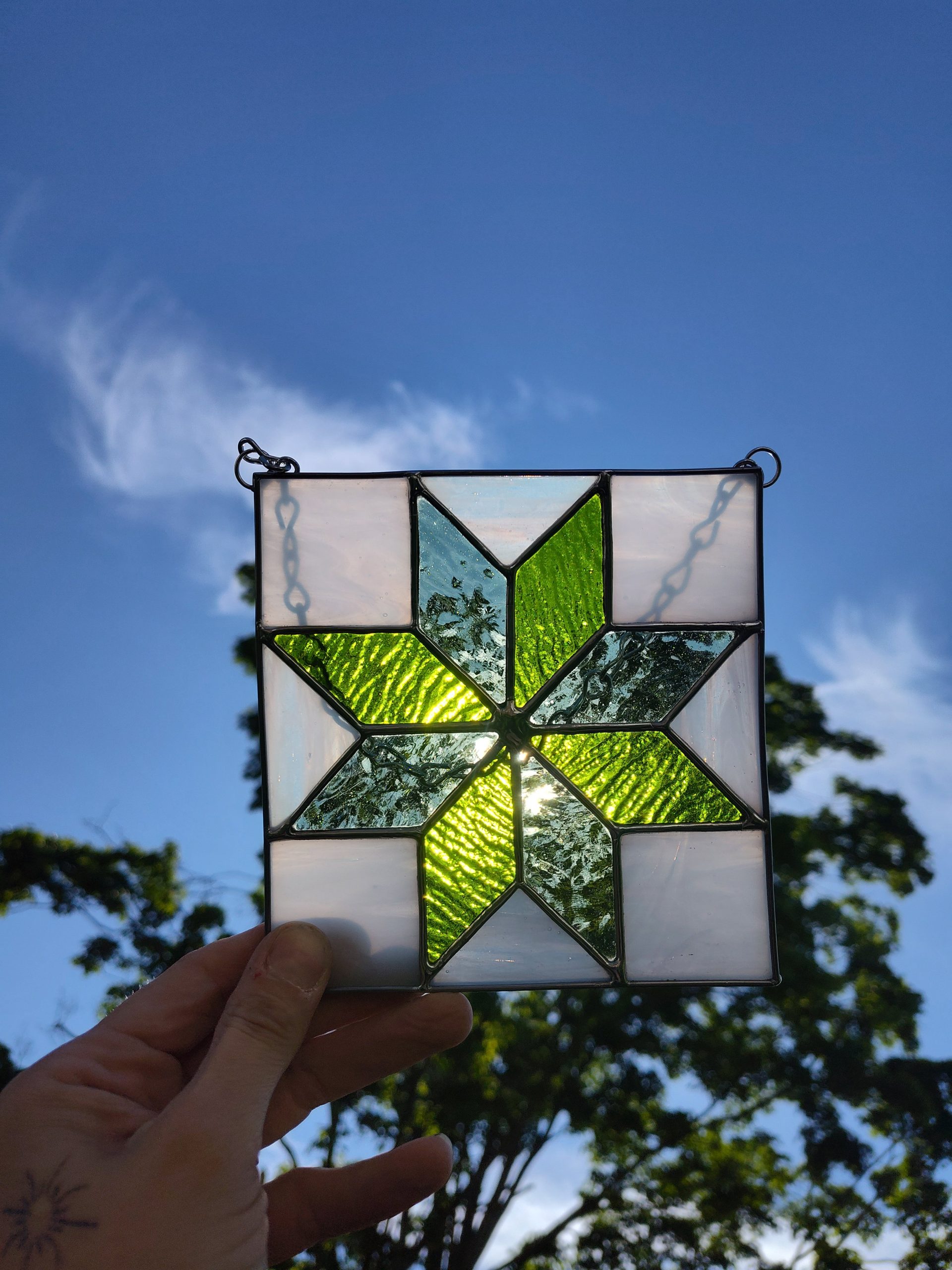 Made with white translucent Wispy, and green transparent textured glass. *Contains Lead*