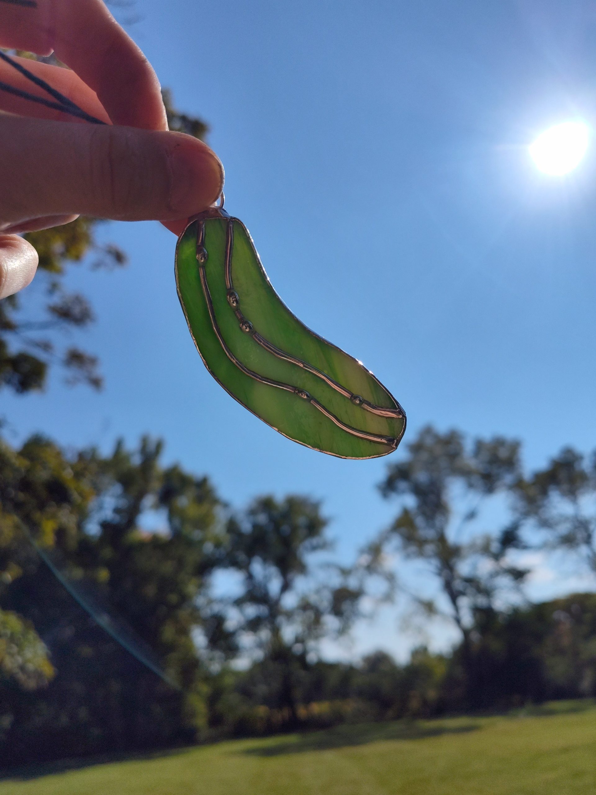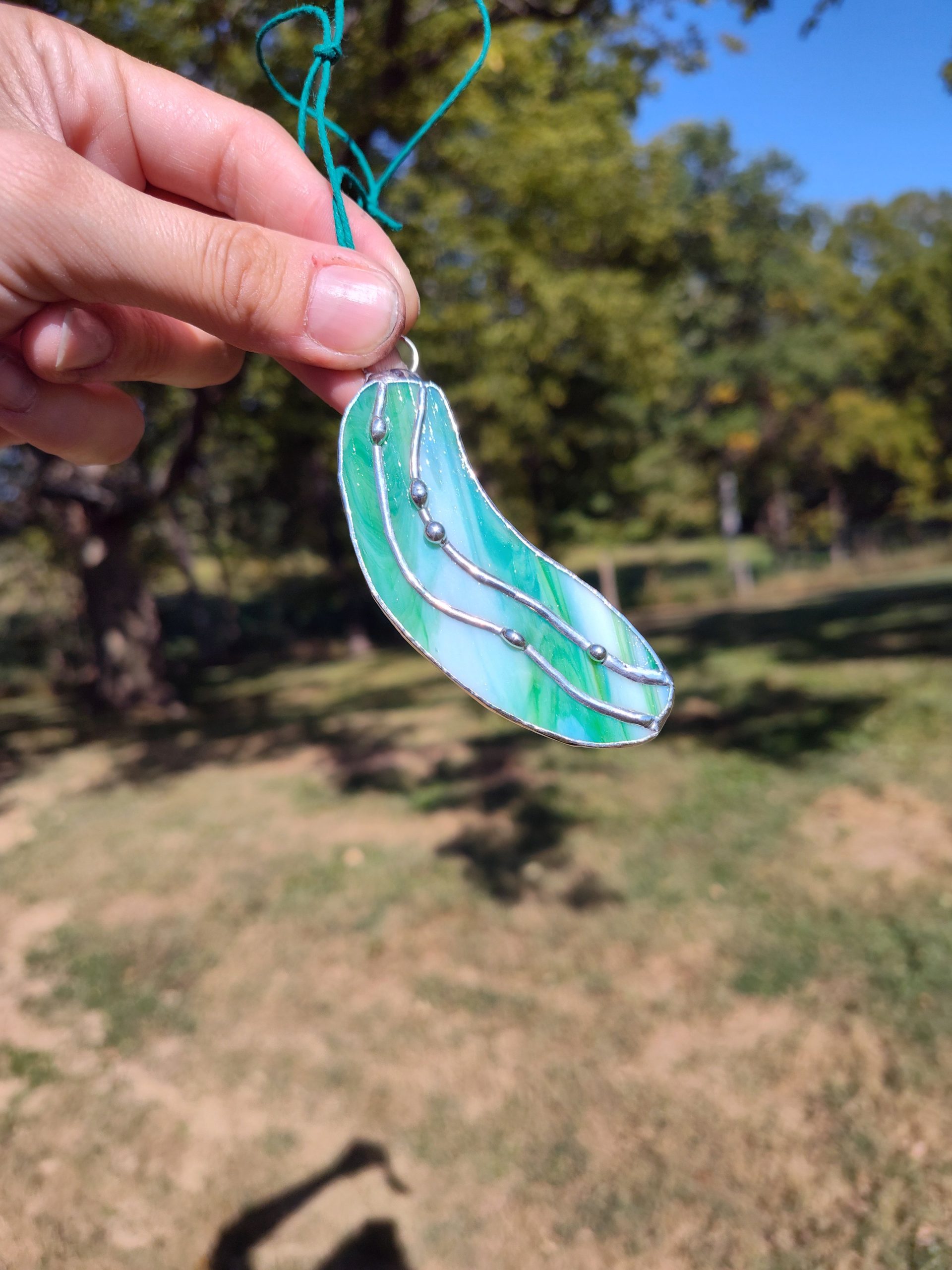 Made with wispy white and green opaque glass. with Solder details. *Contains Lead*