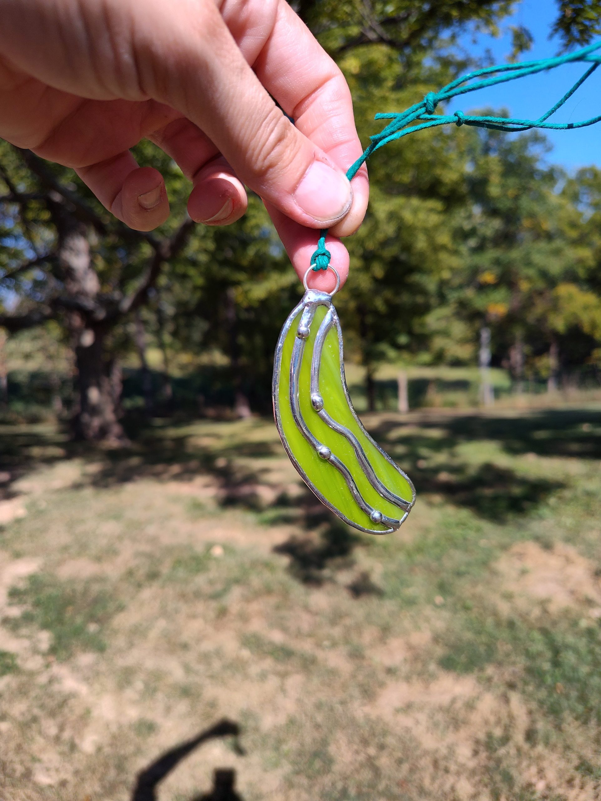This pickle is made with light green opaque glass with solder details. *Contains Lead*