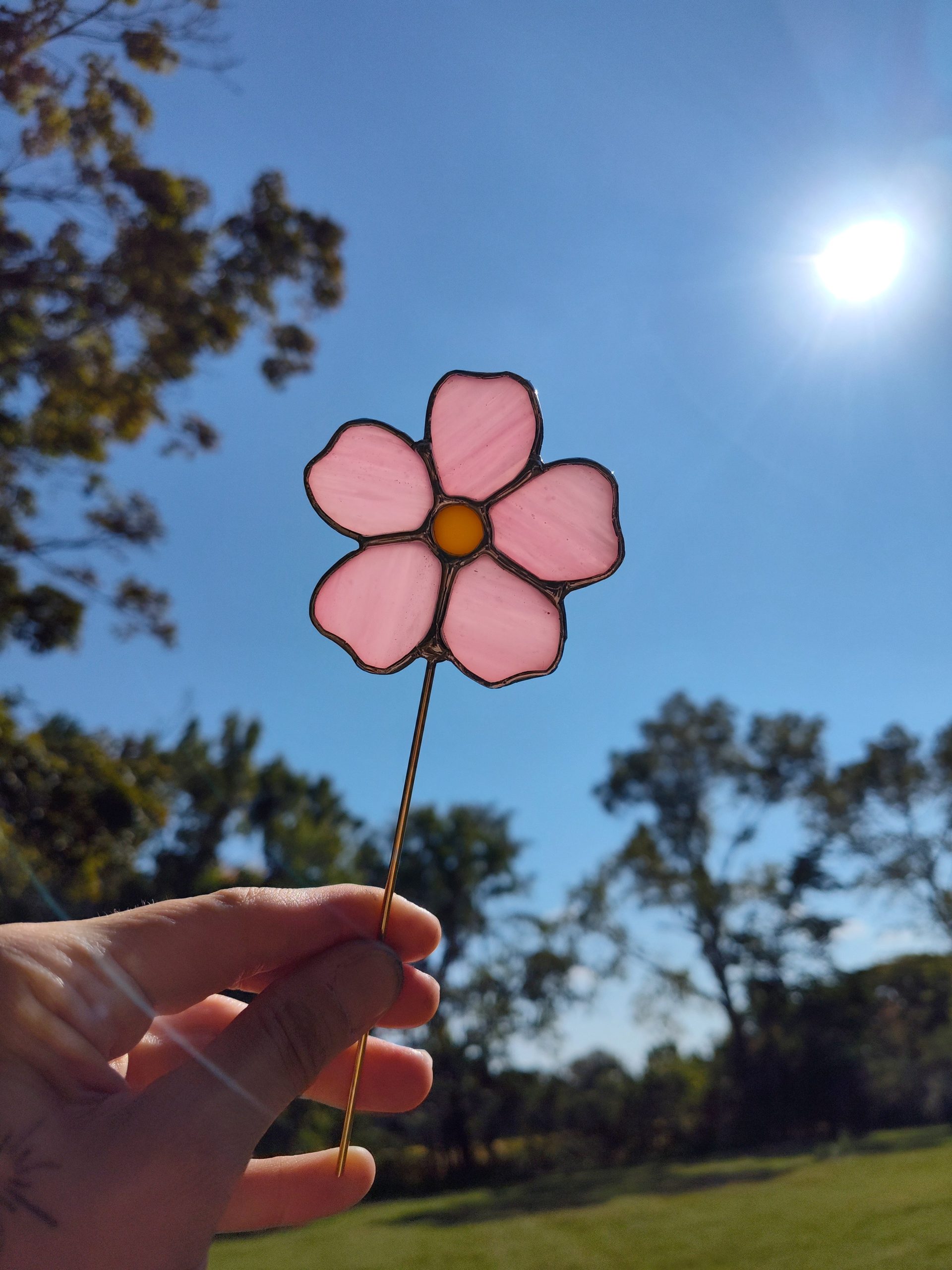 This flower is made with opaque pink and yellow glass. *Contains Lead*