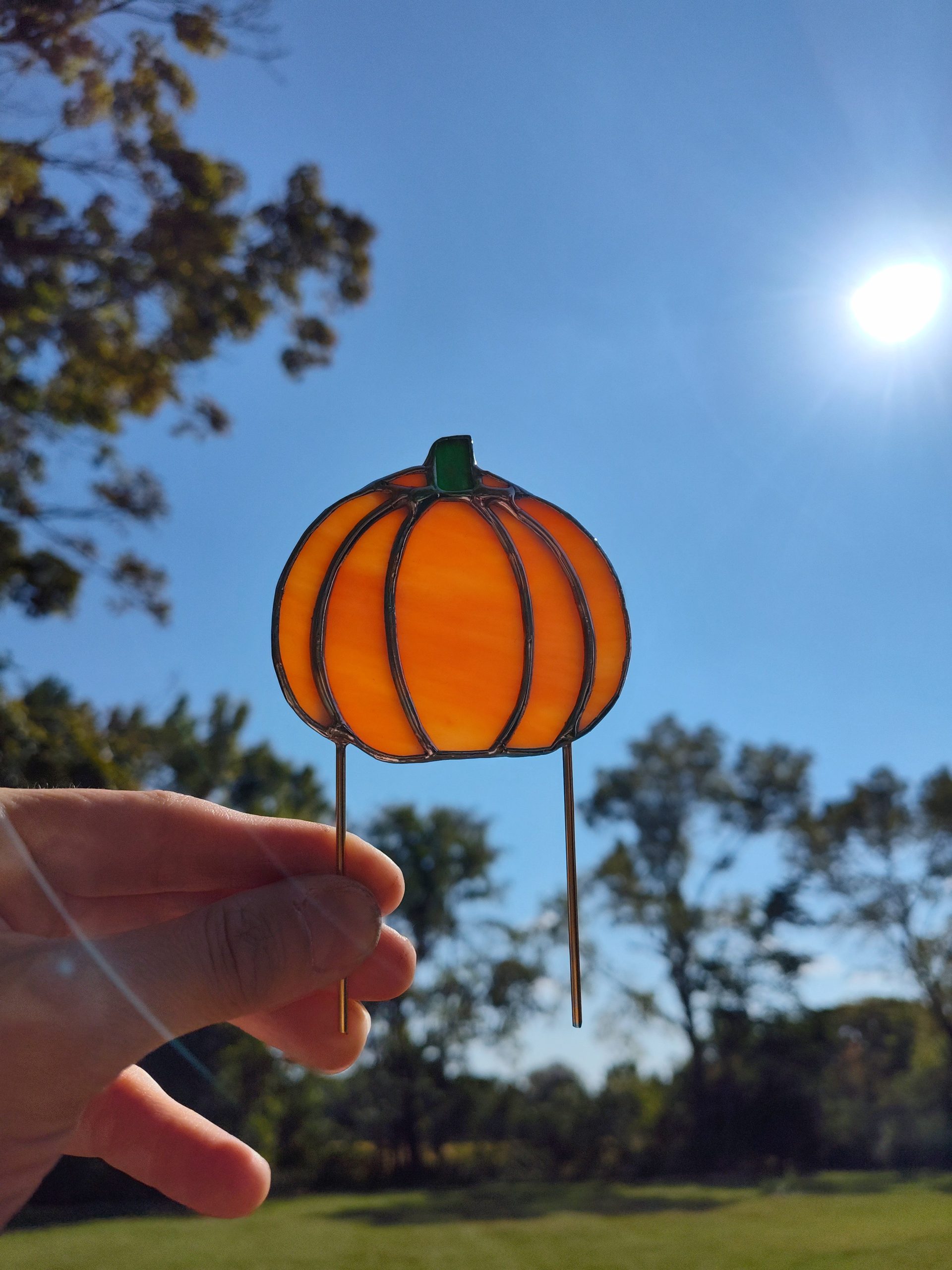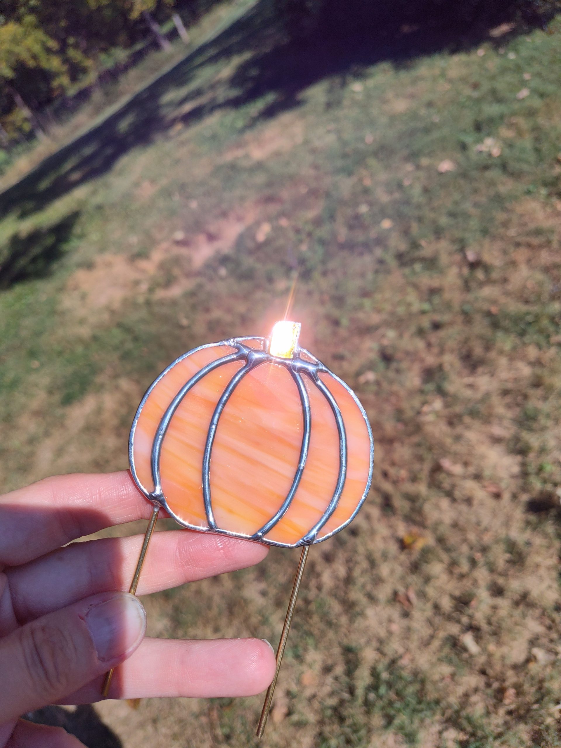This pumpkin is made of orange wispy glass. With a green iridescent top. Touch of fall in your favorite plant!
