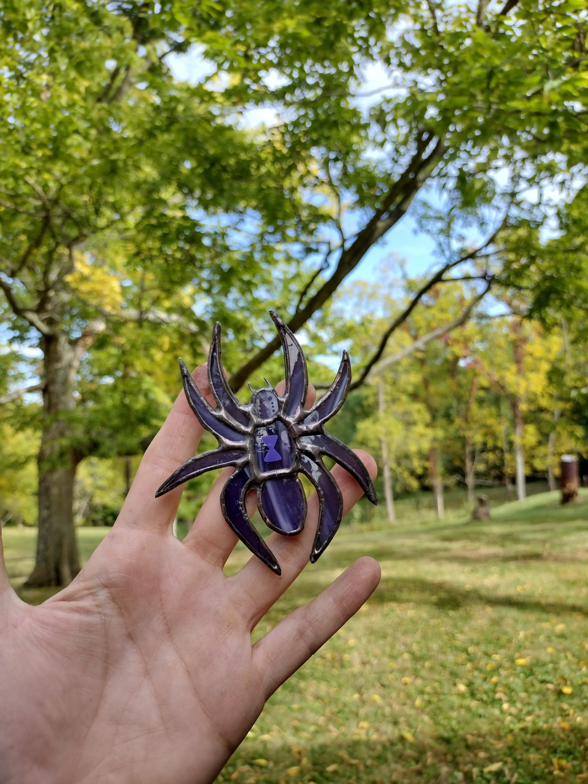 Made with purple streaky glass and has hand painted details fused on by baking. Hang this spider on your favorite plant! *Contains Lead*