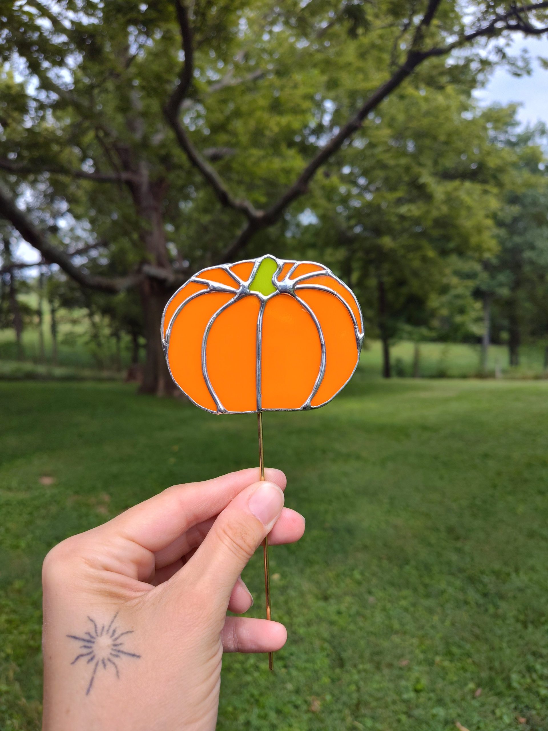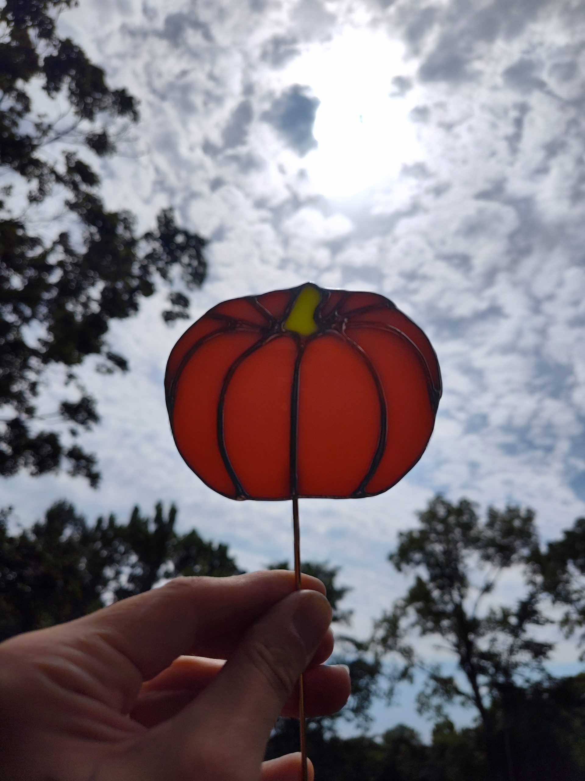 This pumpkin is made of orange and green opaque glass. *Contains Lead*