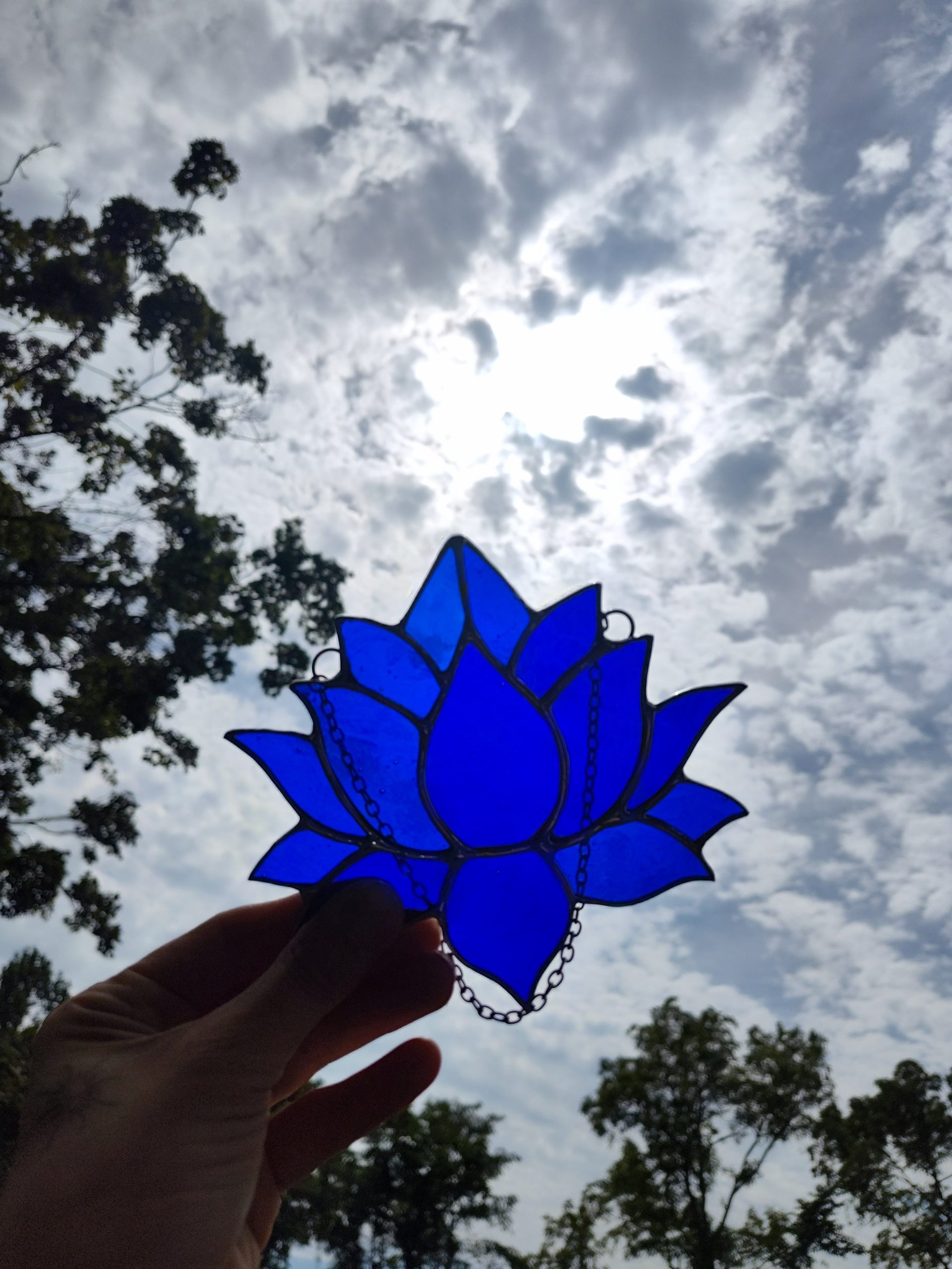 This lotus flower is made up of two different colored blue transparent glass. *Contains Lead*